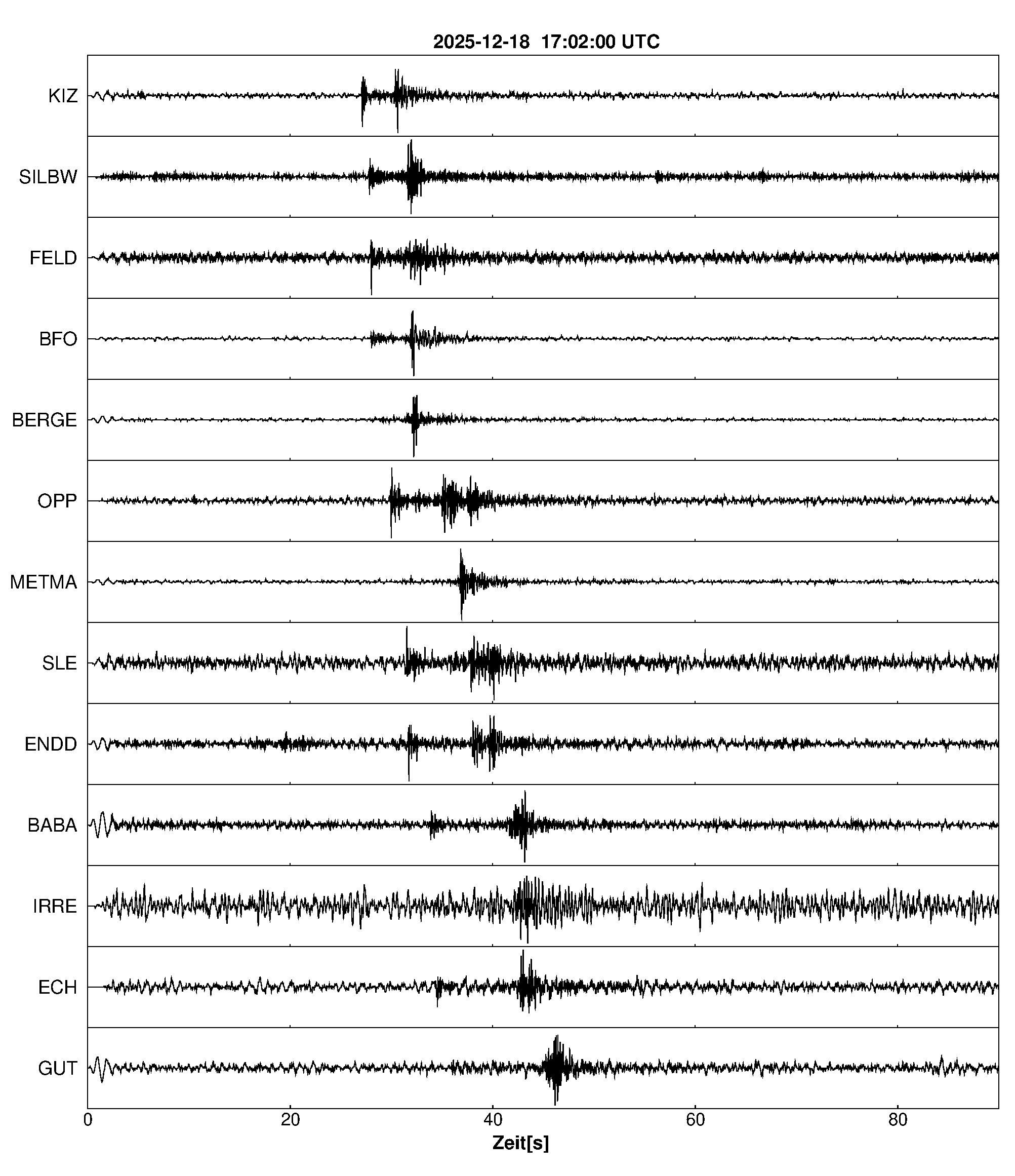 Pfadnavigation Startseite Geologischer Dienst Erdbeben Aktuelle Erdbeben Erdbeben bei Winden im Elztal, Lkrs. Emmendingen, BW Teilen Erdbeben bei Winden im Elztal, Lkrs. Emmendingen, BW Erdbeben bei: Winden im Elztal, Lkrs. Emmendingen, BW Datum/Uhrzeit: am 18.12.2025 um 18:02 Uhr Ortszeit (MEZ) Stärke: 1.1 (Magnitude auf der Richter-Skala) Epizentrum: 48.13° N ㅤ 8.07° E Herdtiefe: ca. 11 km unter der Erdoberfläche Bemerkung: sehr schwaches Erdbeben Seismogramme ausgewählter Erdbebenmessstationen: Erläuterungen: Datum/Uhrzeit:Datum und Zeit des Erdbebens in Ortszeit, also MEZ oder MESZ; Epizentrum:Punkt an der Erdoberfläche über dem Hypozentrum (Lage des Erdbebenherdes in der Tiefe); Magnitude:Erdbebenstärke auf der Richterskala (Lokalmagnitude ML); Herdtiefe:Tiefe des Erdbebens (Hypozentrums) in Kilometern unter NN. Seismogramme:Details zu den Erdbebenmessstationen finden sich im Kartenviewer des LGRB (Baden-Württemberg) und im Kartenviewer des LGB (Rheinland-Pfalz).