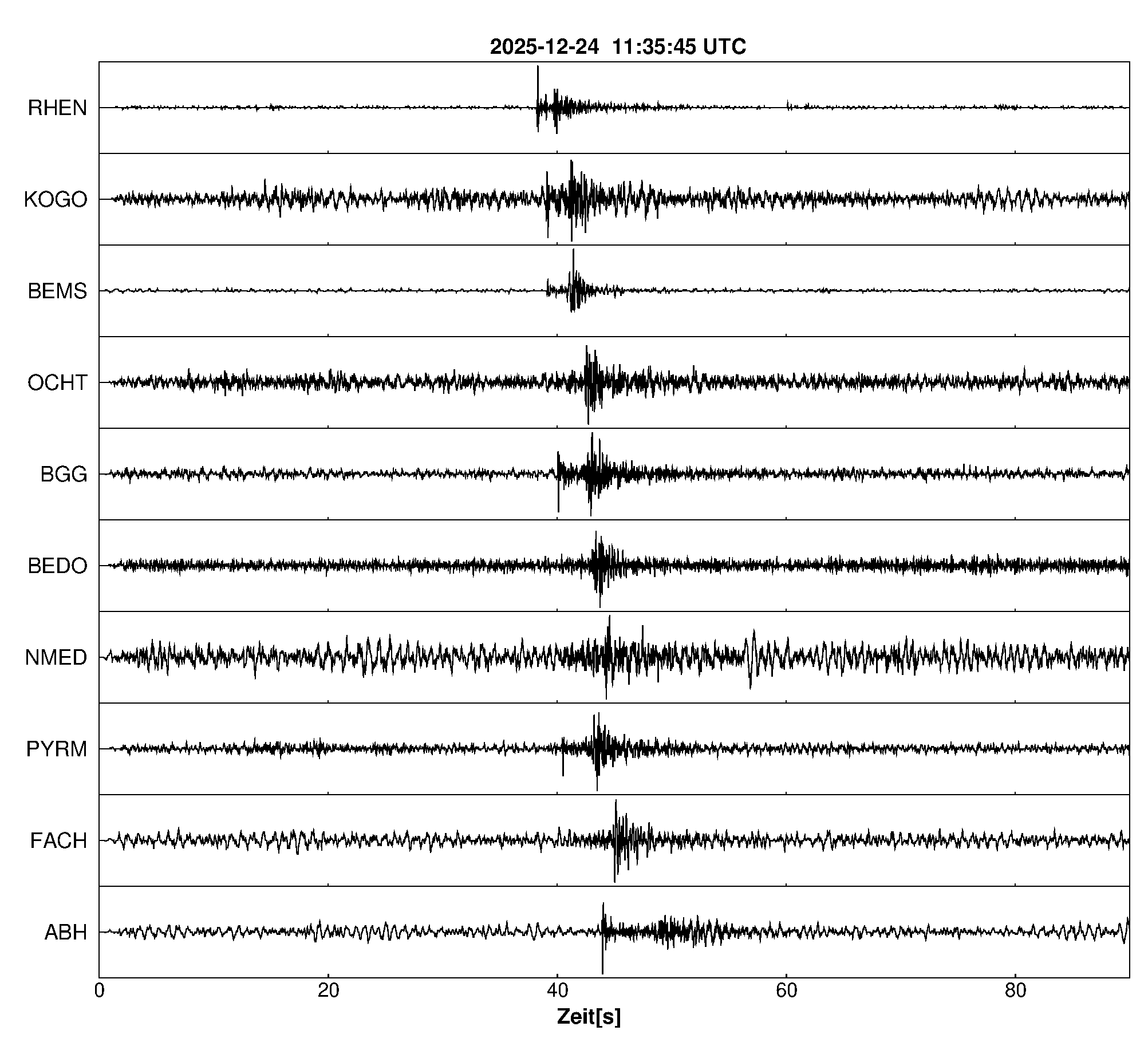 Pfadnavigation Startseite Geologischer Dienst Erdbeben Aktuelle Erdbeben Erdbeben bei Rhens, Lkrs. Mayen-Koblenz, RP Teilen Erdbeben bei Rhens, Lkrs. Mayen-Koblenz, RP Erdbeben bei: Rhens, Lkrs. Mayen-Koblenz, RP Datum/Uhrzeit: am 24.12.2025 um 12:36 Uhr Ortszeit (MEZ) Stärke: 0.8 (Magnitude auf der Richter-Skala) Epizentrum: 50.27° N ㅤ 7.6° E Herdtiefe: ca. 11 km unter der Erdoberfläche Bemerkung: sehr schwaches Erdbeben Seismogramme ausgewählter Erdbebenmessstationen: Erläuterungen: Datum/Uhrzeit:Datum und Zeit des Erdbebens in Ortszeit, also MEZ oder MESZ; Epizentrum:Punkt an der Erdoberfläche über dem Hypozentrum (Lage des Erdbebenherdes in der Tiefe); Magnitude:Erdbebenstärke auf der Richterskala (Lokalmagnitude ML); Herdtiefe:Tiefe des Erdbebens (Hypozentrums) in Kilometern unter NN. Seismogramme:Details zu den Erdbebenmessstationen finden sich im Kartenviewer des LGRB (Baden-Württemberg) und im Kartenviewer des LGB (Rheinland-Pfalz).