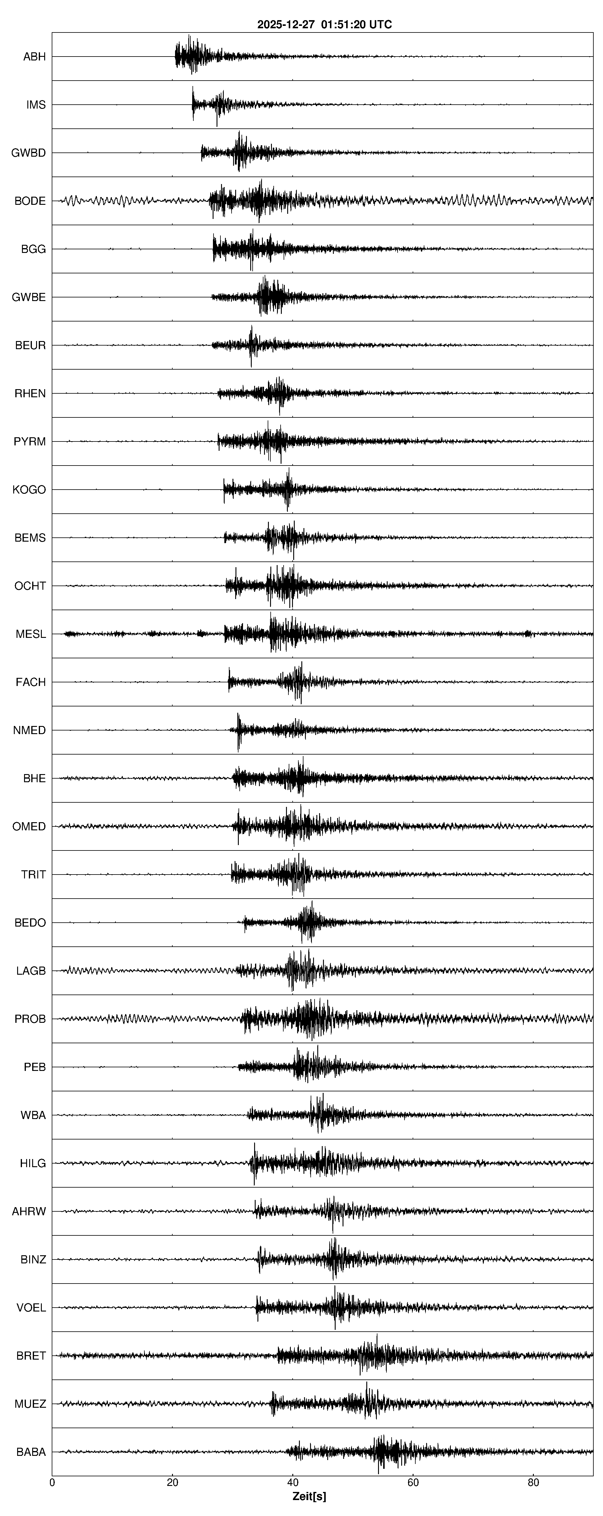 Pfadnavigation Startseite Geologischer Dienst Erdbeben Aktuelle Erdbeben Erdbeben bei Bad Sobernheim, Lkrs. Bad Kreuznach, RP Teilen Erdbeben bei Bad Sobernheim, Lkrs. Bad Kreuznach, RP Erdbeben bei: Bad Sobernheim, Lkrs. Bad Kreuznach, RP Datum/Uhrzeit: am 27.12.2025 um 02:51 Uhr Ortszeit (MEZ) Stärke: 1.6 (Magnitude auf der Richter-Skala) Epizentrum: 49.8° N ㅤ 7.65° E Herdtiefe: ca. 10 km unter der Erdoberfläche Bemerkung: sehr schwaches Erdbeben Seismogramme ausgewählter Erdbebenmessstationen: Erläuterungen: Datum/Uhrzeit:Datum und Zeit des Erdbebens in Ortszeit, also MEZ oder MESZ; Epizentrum:Punkt an der Erdoberfläche über dem Hypozentrum (Lage des Erdbebenherdes in der Tiefe); Magnitude:Erdbebenstärke auf der Richterskala (Lokalmagnitude ML); Herdtiefe:Tiefe des Erdbebens (Hypozentrums) in Kilometern unter NN. Seismogramme:Details zu den Erdbebenmessstationen finden sich im Kartenviewer des LGRB (Baden-Württemberg) und im Kartenviewer des LGB (Rheinland-Pfalz).