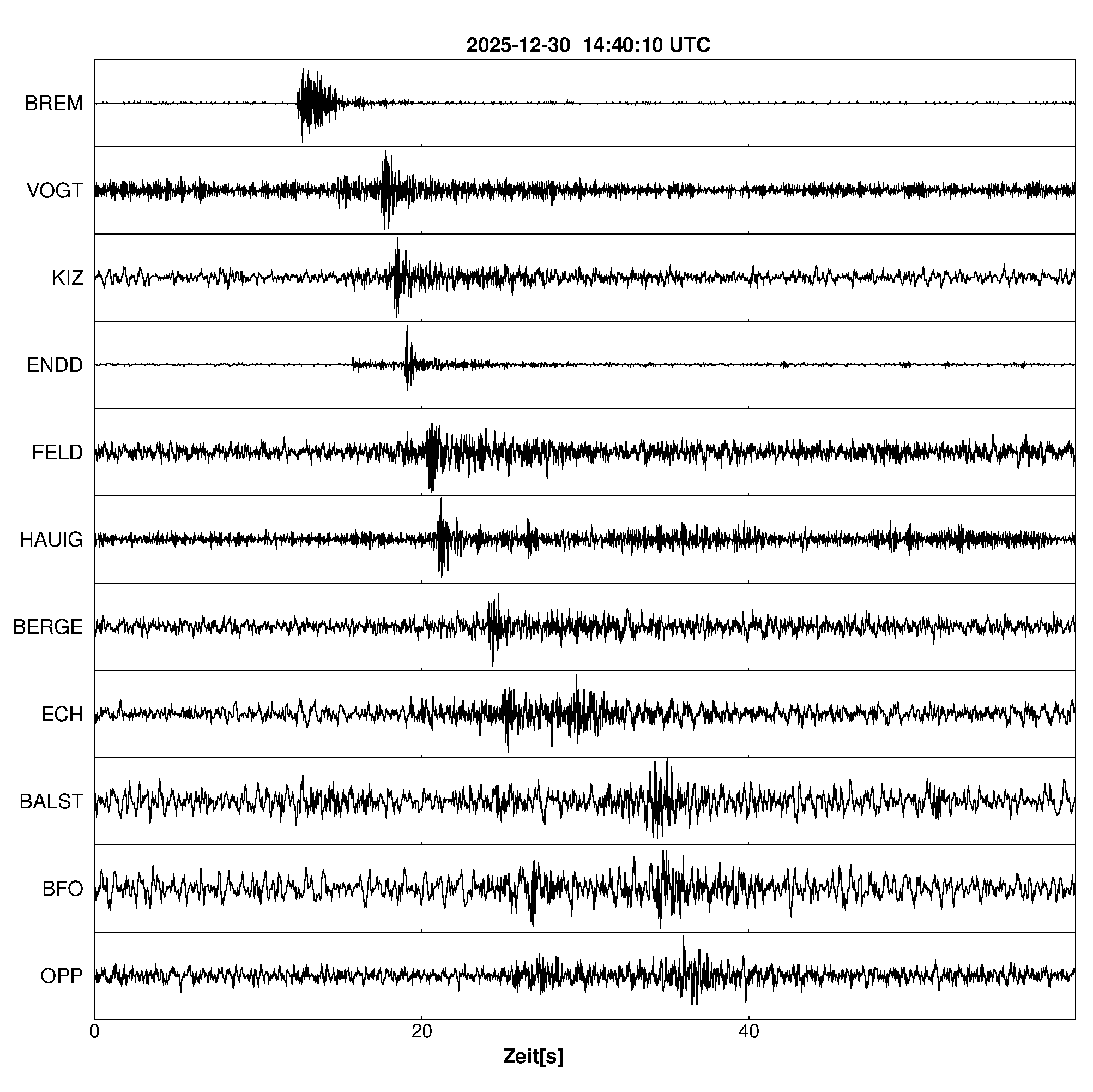 Pfadnavigation Startseite Geologischer Dienst Erdbeben Aktuelle Erdbeben Erdbeben bei Hartheim am Rhein, Lkrs. Breisgau-H., BW Teilen Erdbeben bei Hartheim am Rhein, Lkrs. Breisgau-H., BW Erdbeben bei: Hartheim am Rhein, Lkrs. Breisgau-H., BW Datum/Uhrzeit: am 30.12.2025 um 15:40 Uhr Ortszeit (MEZ) Stärke: 0.8 (Magnitude auf der Richter-Skala) Epizentrum: 47.93° N ㅤ 7.62° E Herdtiefe: ca. 3 km unter der Erdoberfläche Bemerkung: sehr schwaches Erdbeben Seismogramme ausgewählter Erdbebenmessstationen: Erläuterungen: Datum/Uhrzeit:Datum und Zeit des Erdbebens in Ortszeit, also MEZ oder MESZ; Epizentrum:Punkt an der Erdoberfläche über dem Hypozentrum (Lage des Erdbebenherdes in der Tiefe); Magnitude:Erdbebenstärke auf der Richterskala (Lokalmagnitude ML); Herdtiefe:Tiefe des Erdbebens (Hypozentrums) in Kilometern unter NN. Seismogramme:Details zu den Erdbebenmessstationen finden sich im Kartenviewer des LGRB (Baden-Württemberg) und im Kartenviewer des LGB (Rheinland-Pfalz).