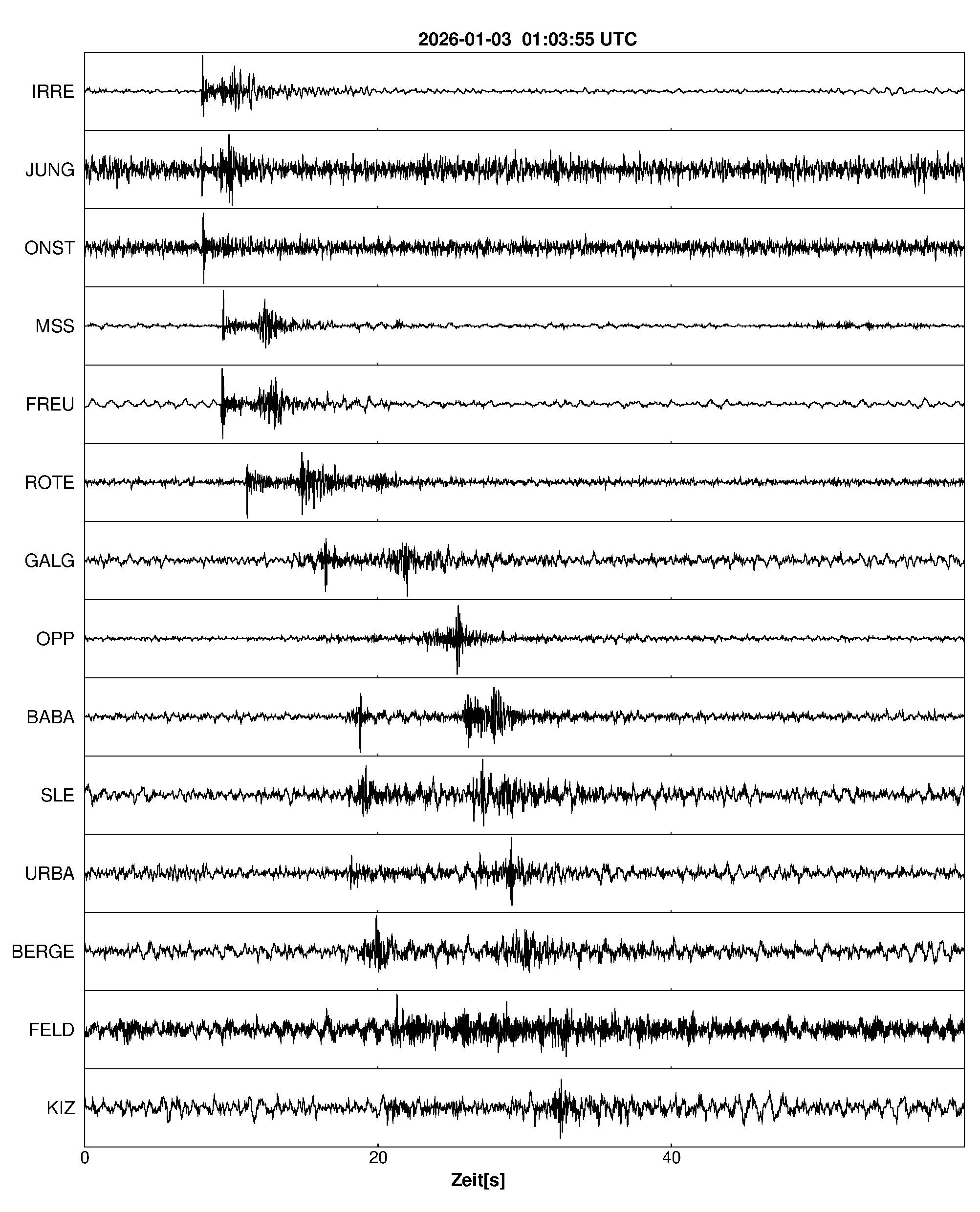 Pfadnavigation Startseite Geologischer Dienst Erdbeben Aktuelle Erdbeben Erdbeben bei Hechingen, Zollernalbkreis, BW Teilen Erdbeben bei Hechingen, Zollernalbkreis, BW Erdbeben bei: Hechingen, Zollernalbkreis, BW Datum/Uhrzeit: am 03.01.2026 um 02:04 Uhr Ortszeit (MEZ) Stärke: 0.8 (Magnitude auf der Richter-Skala) Epizentrum: 48.34° N ㅤ 8.95° E Herdtiefe: ca. 11 km unter der Erdoberfläche Bemerkung: sehr schwaches Erdbeben Seismogramme ausgewählter Erdbebenmessstationen: Erläuterungen: Datum/Uhrzeit:Datum und Zeit des Erdbebens in Ortszeit, also MEZ oder MESZ; Epizentrum:Punkt an der Erdoberfläche über dem Hypozentrum (Lage des Erdbebenherdes in der Tiefe); Magnitude:Erdbebenstärke auf der Richterskala (Lokalmagnitude ML); Herdtiefe:Tiefe des Erdbebens (Hypozentrums) in Kilometern unter NN. Seismogramme:Details zu den Erdbebenmessstationen finden sich im Kartenviewer des LGRB (Baden-Württemberg) und im Kartenviewer des LGB (Rheinland-Pfalz).
