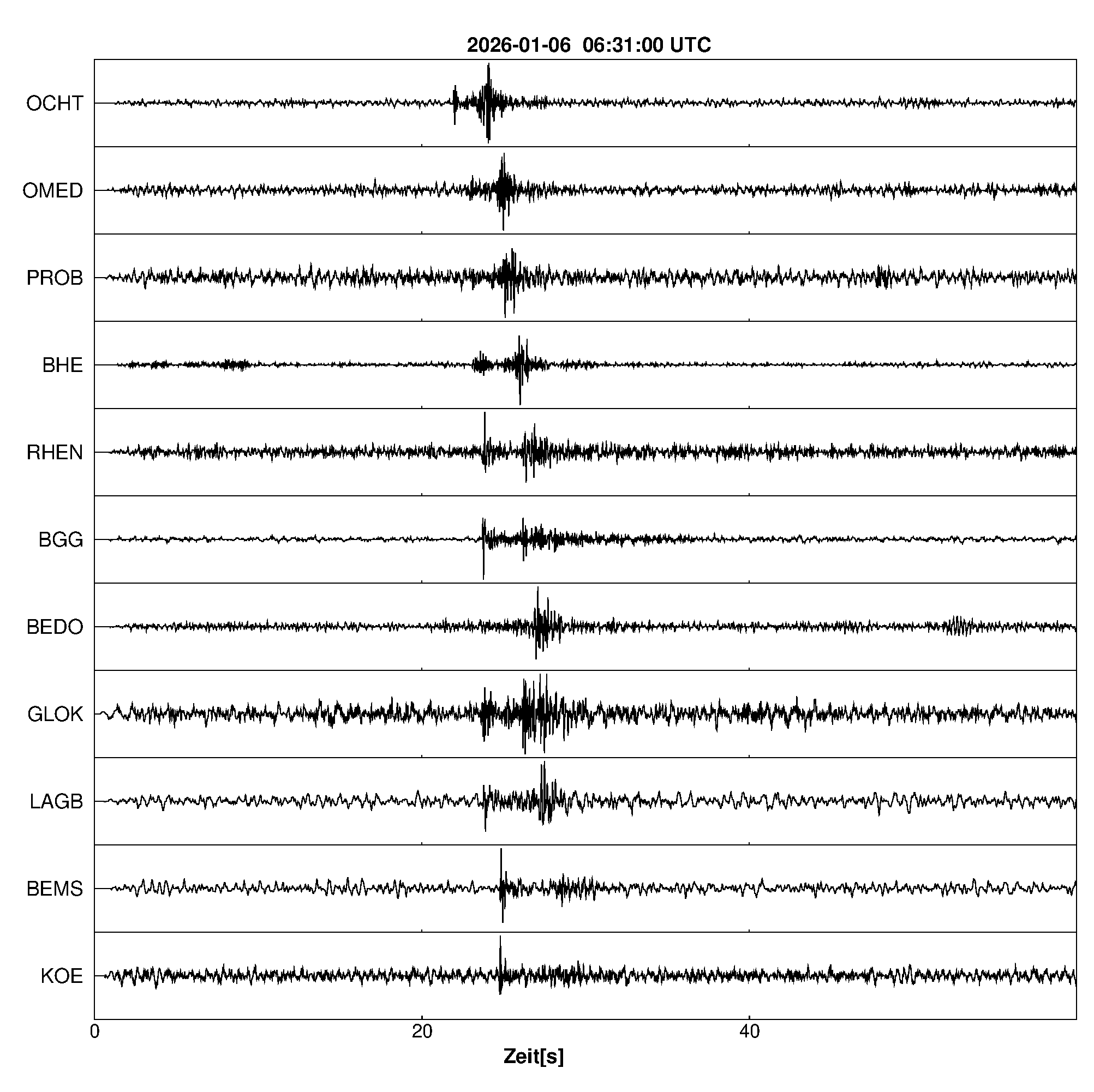 Pfadnavigation Startseite Geologischer Dienst Erdbeben Aktuelle Erdbeben Erdbeben bei Plaidt, Lkrs. Mayen-Koblenz, RP Teilen Erdbeben bei Plaidt, Lkrs. Mayen-Koblenz, RP Erdbeben bei: Plaidt, Lkrs. Mayen-Koblenz, RP Datum/Uhrzeit: am 06.01.2026 um 07:31 Uhr Ortszeit (MEZ) Stärke: 0.5 (Magnitude auf der Richter-Skala) Epizentrum: 50.37° N ㅤ 7.37° E Herdtiefe: ca. 10 km unter der Erdoberfläche Bemerkung: sehr schwaches Erdbeben Seismogramme ausgewählter Erdbebenmessstationen: Erläuterungen: Datum/Uhrzeit:Datum und Zeit des Erdbebens in Ortszeit, also MEZ oder MESZ; Epizentrum:Punkt an der Erdoberfläche über dem Hypozentrum (Lage des Erdbebenherdes in der Tiefe); Magnitude:Erdbebenstärke auf der Richterskala (Lokalmagnitude ML); Herdtiefe:Tiefe des Erdbebens (Hypozentrums) in Kilometern unter NN. Seismogramme:Details zu den Erdbebenmessstationen finden sich im Kartenviewer des LGRB (Baden-Württemberg) und im Kartenviewer des LGB (Rheinland-Pfalz).