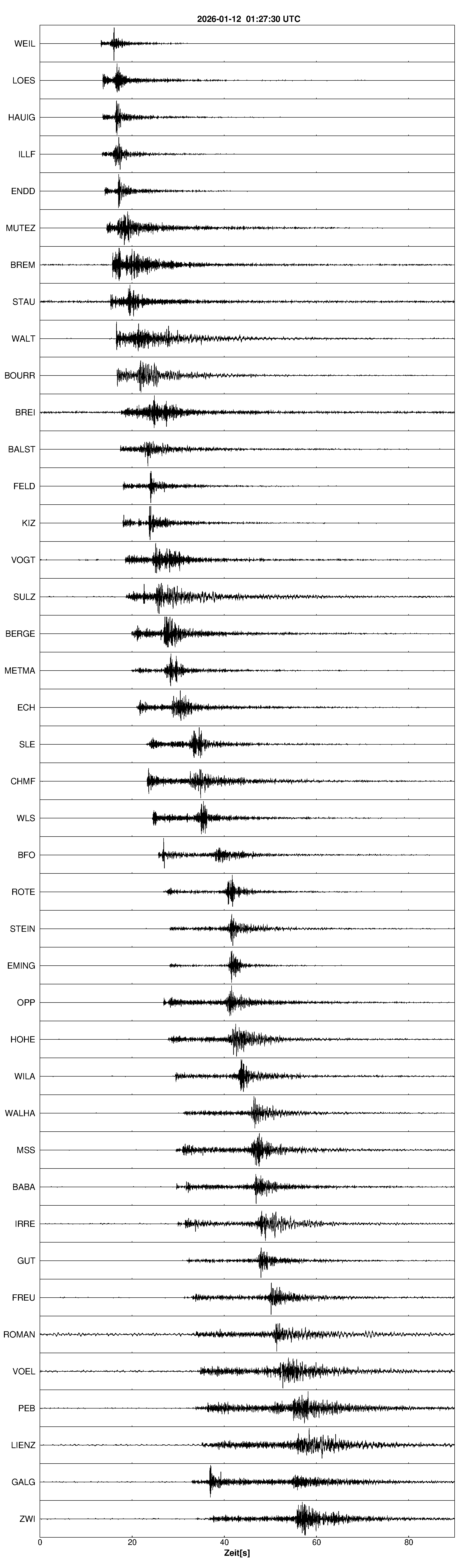 Pfadnavigation Startseite Geologischer Dienst Erdbeben Aktuelle Erdbeben Erdbeben bei Sierentz, Dep. Haut-Rhin, F Teilen Erdbeben bei Sierentz, Dep. Haut-Rhin, F Erdbeben außerhalb von Baden-Württemberg und Rheinland-Pfalz:Die maßgeblichen Angaben veröffentlicht der lokal zuständige Erdbebendienst. Erdbeben bei: Sierentz, Dep. Haut-Rhin, F Datum/Uhrzeit: am 12.01.2026 um 02:27 Uhr Ortszeit (MEZ) Stärke: 2,4 (Magnitude auf der Richter-Skala) Epizentrum: 47,68° N ㅤ 7,48° E Herdtiefe: ca. 13 km unter der Erdoberfläche Wahrnehmungen: vereinzelt wahrgenommen am südlichen Oberrhein Bemerkung: schwaches Erdbeben Seismogramme ausgewählter Erdbebenmessstationen: Erläuterungen: Datum/Uhrzeit:Datum und Zeit des Erdbebens in Ortszeit, also MEZ oder MESZ; Epizentrum:Punkt an der Erdoberfläche über dem Hypozentrum (Lage des Erdbebenherdes in der Tiefe); Magnitude:Erdbebenstärke auf der Richterskala (Lokalmagnitude ML); Herdtiefe:Tiefe des Erdbebens (Hypozentrums) in Kilometern unter NN. Seismogramme:Details zu den Erdbebenmessstationen finden sich im Kartenviewer des LGRB (Baden-Württemberg) und im Kartenviewer des LGB (Rheinland-Pfalz).