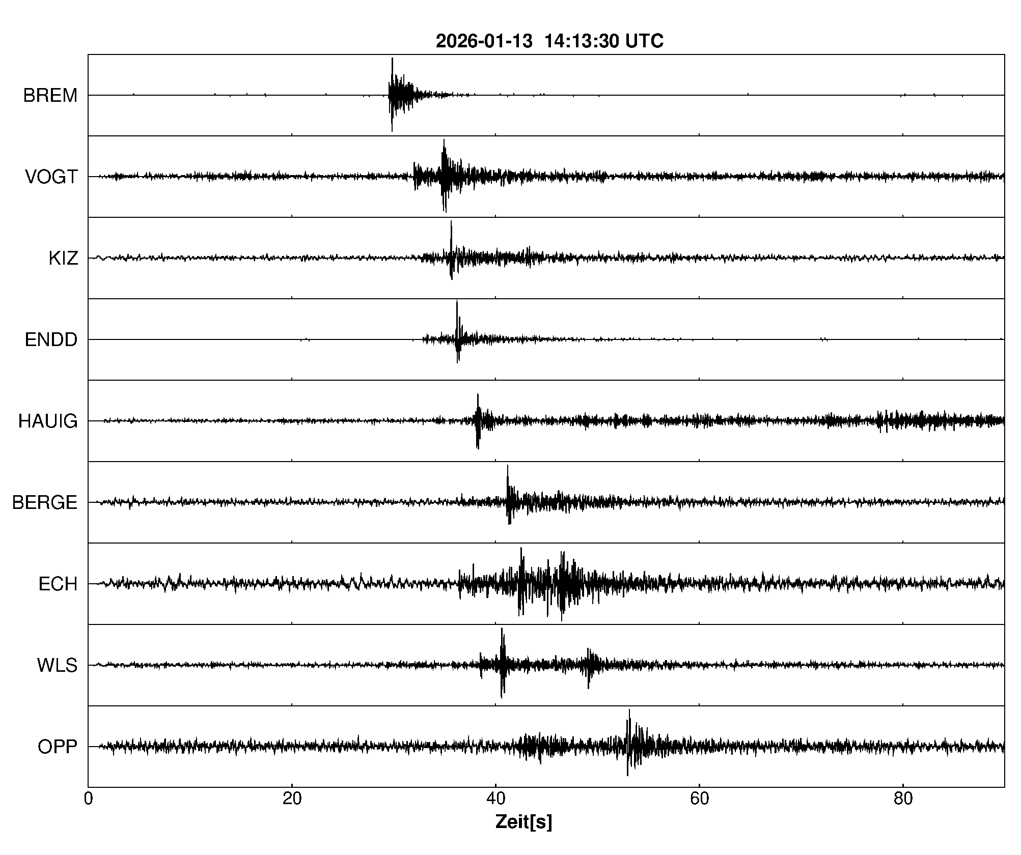 Pfadnavigation Startseite Geologischer Dienst Erdbeben Aktuelle Erdbeben Erdbeben bei Hartheim am Rhein, Lkrs. Breisgau-H., BW Teilen Erdbeben bei Hartheim am Rhein, Lkrs. Breisgau-H., BW Erdbeben bei: Hartheim am Rhein, Lkrs. Breisgau-H., BW Datum/Uhrzeit: am 13.01.2026 um 15:13 Uhr Ortszeit (MEZ) Stärke: 1,0 (Magnitude auf der Richter-Skala) Epizentrum: 47,93° N ㅤ 7,62° E Herdtiefe: ca. 4 km unter der Erdoberfläche Bemerkung: sehr schwaches Erdbeben Seismogramme ausgewählter Erdbebenmessstationen: Erläuterungen: Datum/Uhrzeit:Datum und Zeit des Erdbebens in Ortszeit, also MEZ oder MESZ; Epizentrum:Punkt an der Erdoberfläche über dem Hypozentrum (Lage des Erdbebenherdes in der Tiefe); Magnitude:Erdbebenstärke auf der Richterskala (Lokalmagnitude ML); Herdtiefe:Tiefe des Erdbebens (Hypozentrums) in Kilometern unter NN. Seismogramme:Details zu den Erdbebenmessstationen finden sich im Kartenviewer des LGRB (Baden-Württemberg) und im Kartenviewer des LGB (Rheinland-Pfalz).