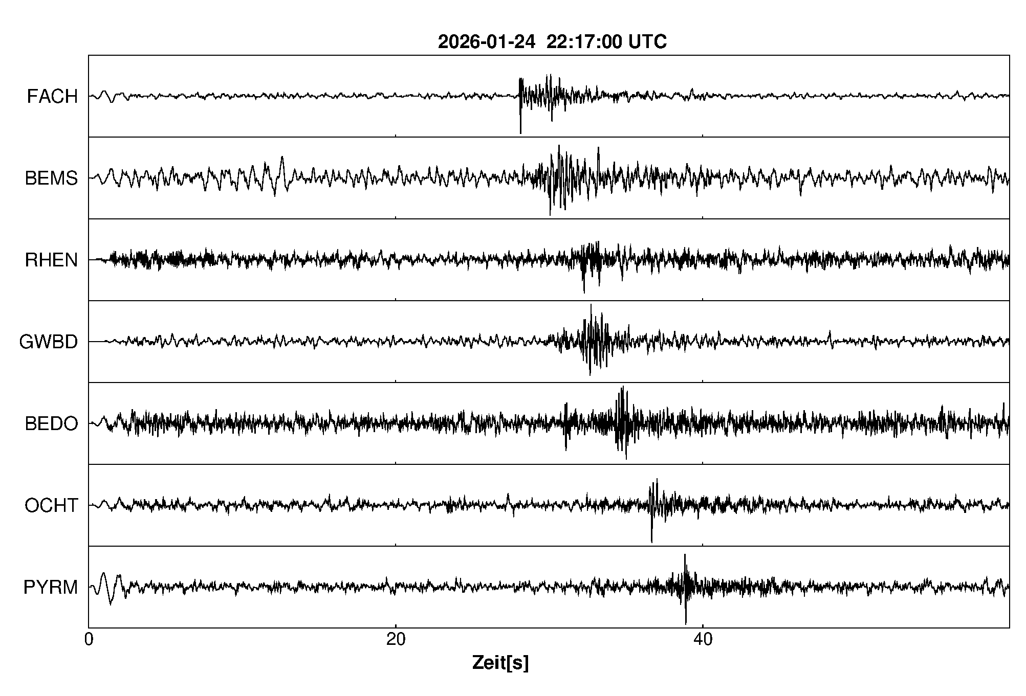 Pfadnavigation Startseite Geologischer Dienst Erdbeben Aktuelle Erdbeben Erdbeben bei Attenhausen, Rhein-Lahn-Kreis, RP Teilen Erdbeben bei Attenhausen, Rhein-Lahn-Kreis, RP Erdbeben bei: Attenhausen, Rhein-Lahn-Kreis, RP Datum/Uhrzeit: am 24.01.2026 um 23:17 Uhr Ortszeit (MEZ) Stärke: 0,5 (Magnitude auf der Richter-Skala) Epizentrum: 50,29° N ㅤ 7,87° E Herdtiefe: ca. 3 km unter der Erdoberfläche Bemerkung: sehr schwaches Erdbeben Seismogramme ausgewählter Erdbebenmessstationen: Erläuterungen: Datum/Uhrzeit:Datum und Zeit des Erdbebens in Ortszeit, also MEZ oder MESZ; Epizentrum:Punkt an der Erdoberfläche über dem Hypozentrum (Lage des Erdbebenherdes in der Tiefe); Magnitude:Erdbebenstärke auf der Richterskala (Lokalmagnitude ML); Herdtiefe:Tiefe des Erdbebens (Hypozentrums) in Kilometern unter NN. Seismogramme:Details zu den Erdbebenmessstationen finden sich im Kartenviewer des LGRB (Baden-Württemberg) und im Kartenviewer des LGB (Rheinland-Pfalz).