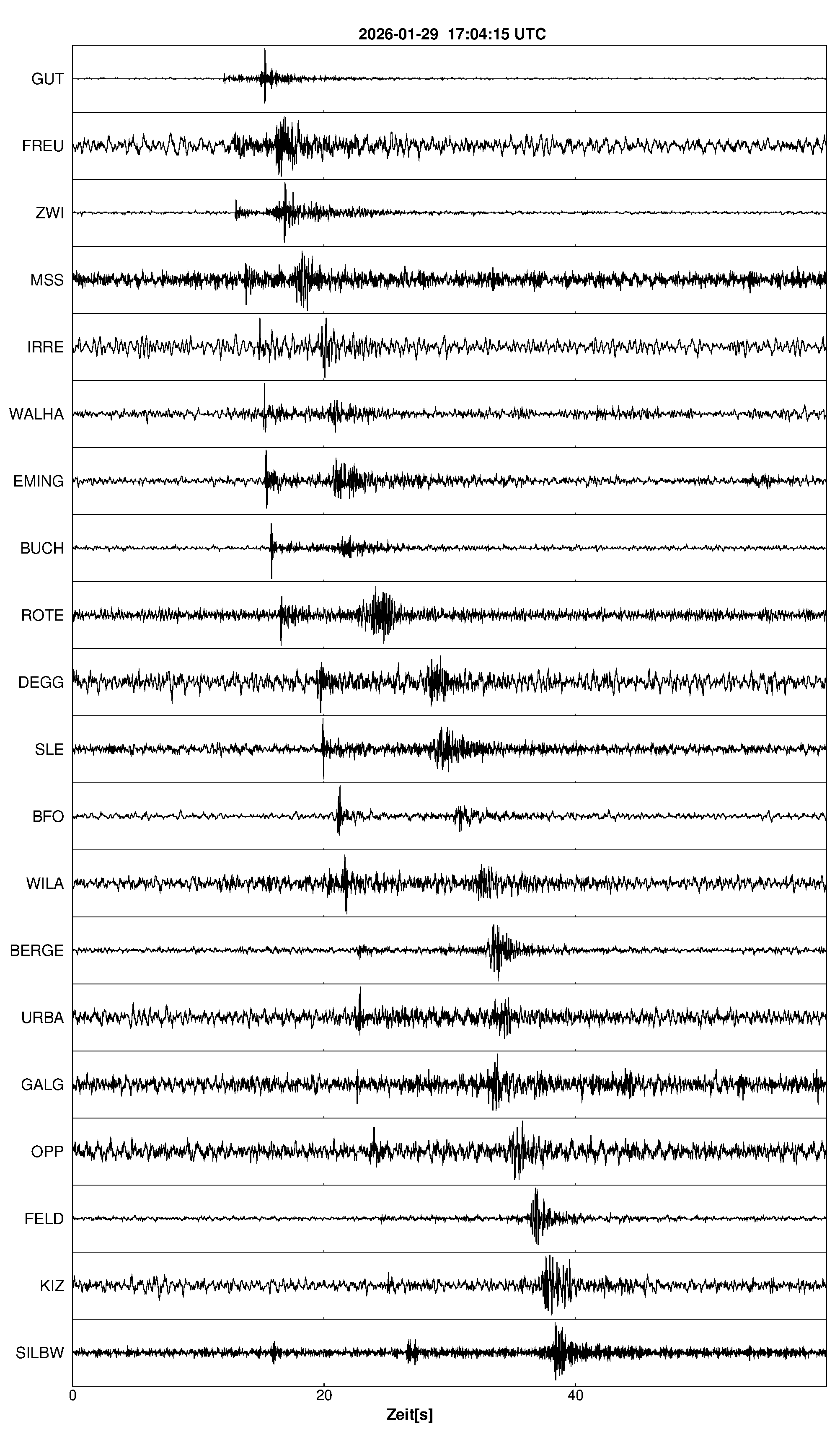 Pfadnavigation Startseite Geologischer Dienst Erdbeben Aktuelle Erdbeben Erdbeben bei Scheer, Lkrs. Sigmaringen, BW Teilen Erdbeben bei Scheer, Lkrs. Sigmaringen, BW Erdbeben bei: Scheer, Lkrs. Sigmaringen, BW Datum/Uhrzeit: am 29.01.2026 um 18:04 Uhr Ortszeit (MEZ) Stärke: 1,2 (Magnitude auf der Richter-Skala) Epizentrum: 48,09° N ㅤ 9,29° E Herdtiefe: ca. 20 km unter der Erdoberfläche Bemerkung: sehr schwaches Erdbeben Seismogramme ausgewählter Erdbebenmessstationen: Erläuterungen: Datum/Uhrzeit:Datum und Zeit des Erdbebens in Ortszeit, also MEZ oder MESZ; Epizentrum:Punkt an der Erdoberfläche über dem Hypozentrum (Lage des Erdbebenherdes in der Tiefe); Magnitude:Erdbebenstärke auf der Richterskala (Lokalmagnitude ML); Herdtiefe:Tiefe des Erdbebens (Hypozentrums) in Kilometern unter NN. Seismogramme:Details zu den Erdbebenmessstationen finden sich im Kartenviewer des LGRB (Baden-Württemberg) und im Kartenviewer des LGB (Rheinland-Pfalz).
