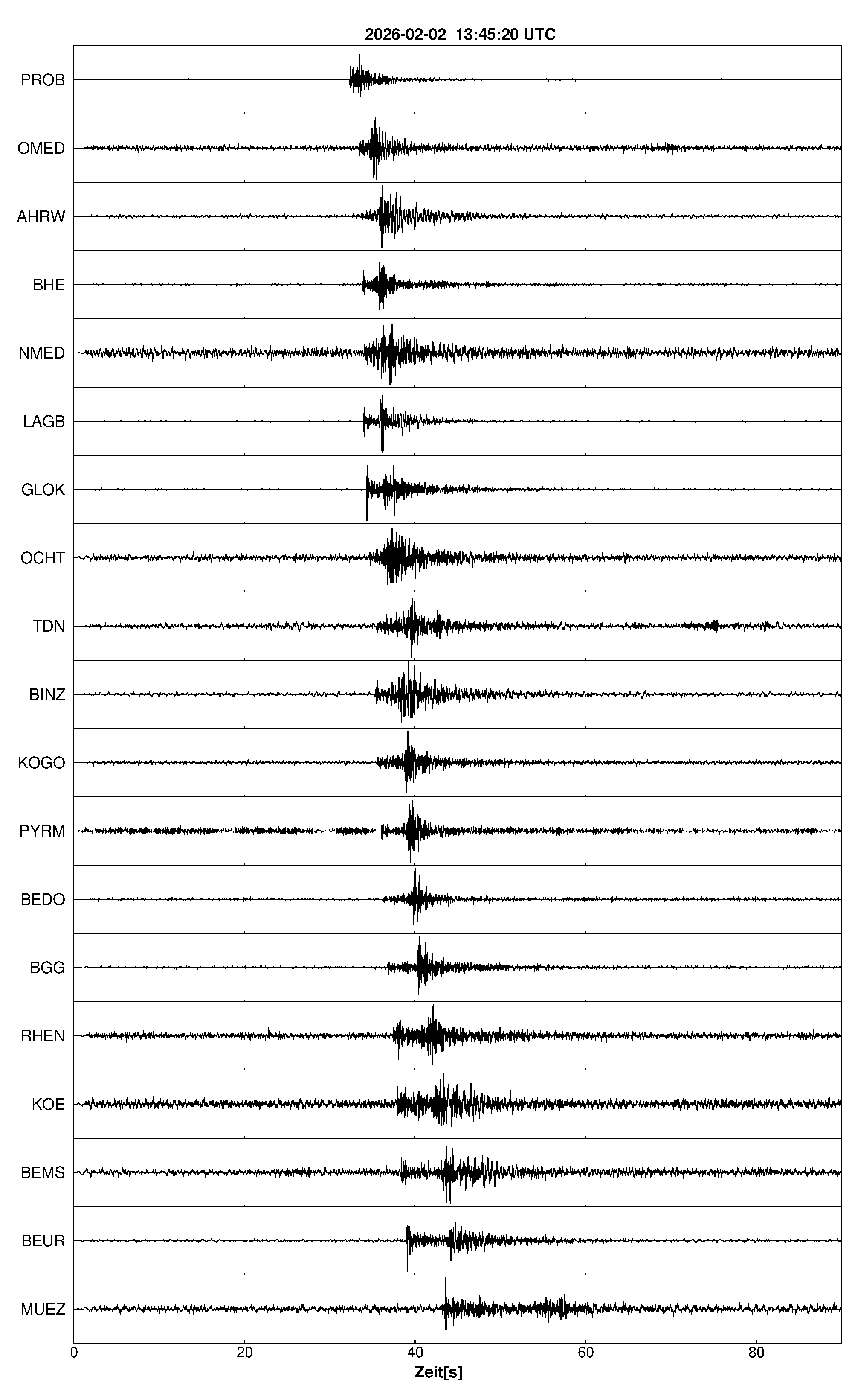 Pfadnavigation Startseite Geologischer Dienst Erdbeben Aktuelle Erdbeben Erdbeben bei Waldorf, Lkrs. Ahrweiler, RP Teilen Erdbeben bei Waldorf, Lkrs. Ahrweiler, RP Erdbeben bei: Waldorf, Lkrs. Ahrweiler, RP Datum/Uhrzeit: am 02.02.2026 um 14:45 Uhr Ortszeit (MEZ) Stärke: 1,2 (Magnitude auf der Richter-Skala) Epizentrum: 50,48° N ㅤ 7,21° E Herdtiefe: ca. 3 km unter der Erdoberfläche Bemerkung: sehr schwaches Erdbeben Seismogramme ausgewählter Erdbebenmessstationen: Erläuterungen: Datum/Uhrzeit:Datum und Zeit des Erdbebens in Ortszeit, also MEZ oder MESZ; Epizentrum:Punkt an der Erdoberfläche über dem Hypozentrum (Lage des Erdbebenherdes in der Tiefe); Magnitude:Erdbebenstärke auf der Richterskala (Lokalmagnitude ML); Herdtiefe:Tiefe des Erdbebens (Hypozentrums) in Kilometern unter NN. Seismogramme:Details zu den Erdbebenmessstationen finden sich im Kartenviewer des LGRB (Baden-Württemberg) und im Kartenviewer des LGB (Rheinland-Pfalz).