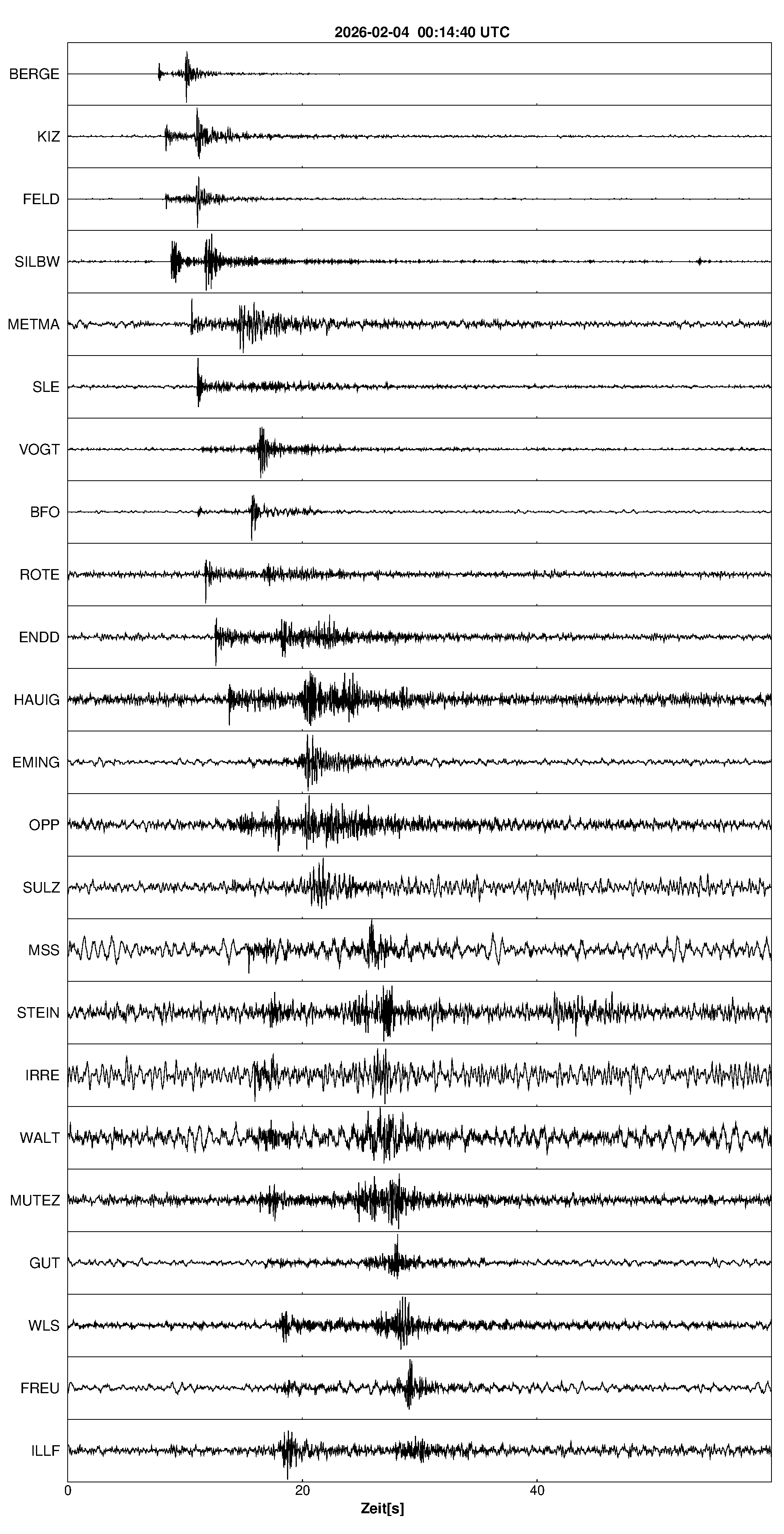 Pfadnavigation Startseite Geologischer Dienst Erdbeben Aktuelle Erdbeben Erdbeben bei Furtwangen im Schwarzwald, Schwarzwald-Baar-Kreis Teilen Erdbeben bei Furtwangen im Schwarzwald, Schwarzwald-Baar-Kreis Erdbeben außerhalb von Baden-Württemberg und Rheinland-Pfalz:Die maßgeblichen Angaben veröffentlicht der lokal zuständige Erdbebendienst. Erdbeben bei: Furtwangen im Schwarzwald, Schwarzwald-Baar-Kreis Datum/Uhrzeit: am 04.02.2026 um 01:14 Uhr Ortszeit (MEZ) Stärke: 1,1 (Magnitude auf der Richter-Skala) Epizentrum: 48,01° N ㅤ 8,16° E Herdtiefe: ca. 10 km unter der Erdoberfläche Bemerkung: sehr schwaches Erdbeben Seismogramme ausgewählter Erdbebenmessstationen: Erläuterungen: Datum/Uhrzeit:Datum und Zeit des Erdbebens in Ortszeit, also MEZ oder MESZ; Epizentrum:Punkt an der Erdoberfläche über dem Hypozentrum (Lage des Erdbebenherdes in der Tiefe); Magnitude:Erdbebenstärke auf der Richterskala (Lokalmagnitude ML); Herdtiefe:Tiefe des Erdbebens (Hypozentrums) in Kilometern unter NN. Seismogramme:Details zu den Erdbebenmessstationen finden sich im Kartenviewer des LGRB (Baden-Württemberg) und im Kartenviewer des LGB (Rheinland-Pfalz).