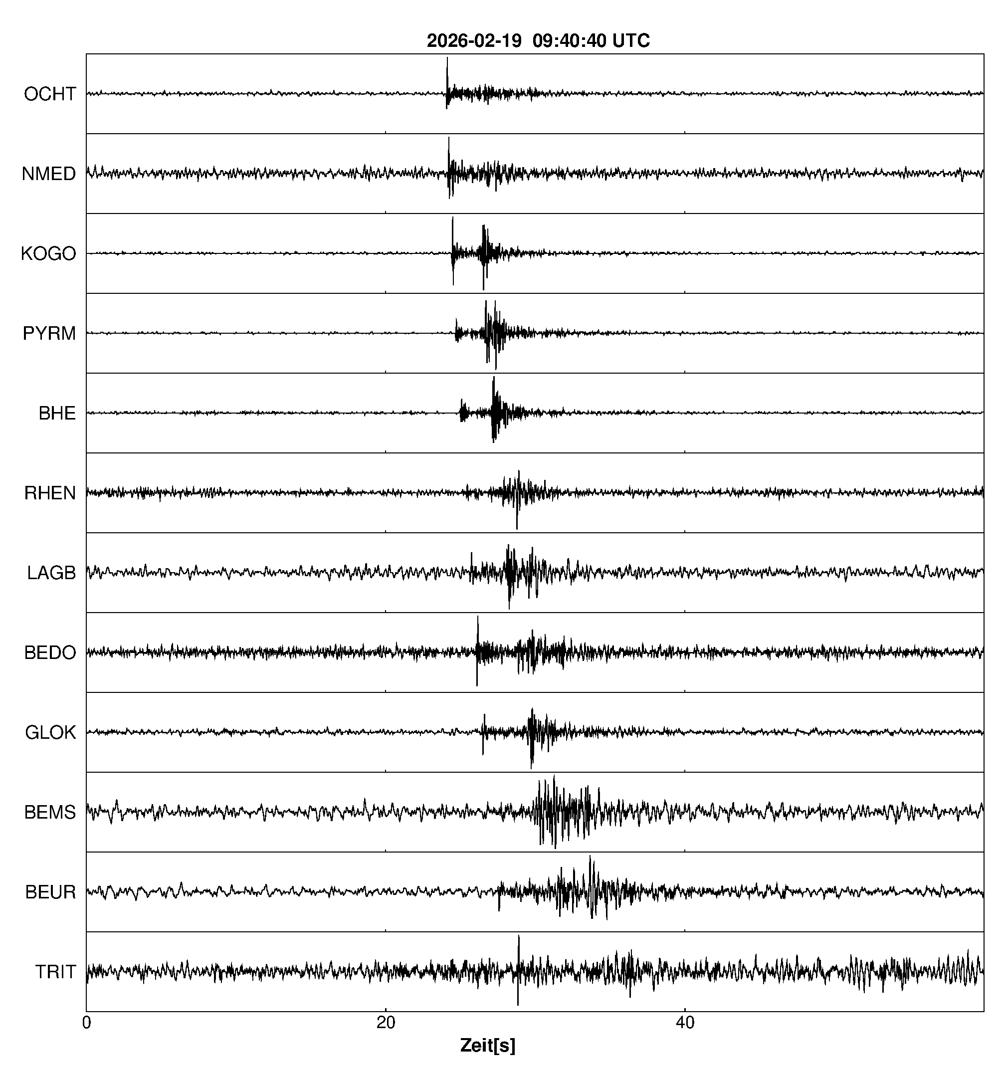 Pfadnavigation Startseite Geologischer Dienst Erdbeben Aktuelle Erdbeben Erdbeben bei Polch, Lkrs. Mayen-Koblenz, RP Teilen Erdbeben bei Polch, Lkrs. Mayen-Koblenz, RP Erdbeben bei: Polch, Lkrs. Mayen-Koblenz, RP Datum/Uhrzeit: am 19.02.2026 um 10:41 Uhr Ortszeit (MEZ) Stärke: 1,0 (Magnitude auf der Richter-Skala) Epizentrum: 50,32° N ㅤ 7,36° E Herdtiefe: ca. 15 km unter der Erdoberfläche Bemerkung: sehr schwaches Erdbeben Seismogramme ausgewählter Erdbebenmessstationen: Erläuterungen: Datum/Uhrzeit:Datum und Zeit des Erdbebens in Ortszeit, also MEZ oder MESZ; Epizentrum:Punkt an der Erdoberfläche über dem Hypozentrum (Lage des Erdbebenherdes in der Tiefe); Magnitude:Erdbebenstärke auf der Richterskala (Lokalmagnitude ML); Herdtiefe:Tiefe des Erdbebens (Hypozentrums) in Kilometern unter NN. Seismogramme:Details zu den Erdbebenmessstationen finden sich im Kartenviewer des LGRB (Baden-Württemberg) und im Kartenviewer des LGB (Rheinland-Pfalz).