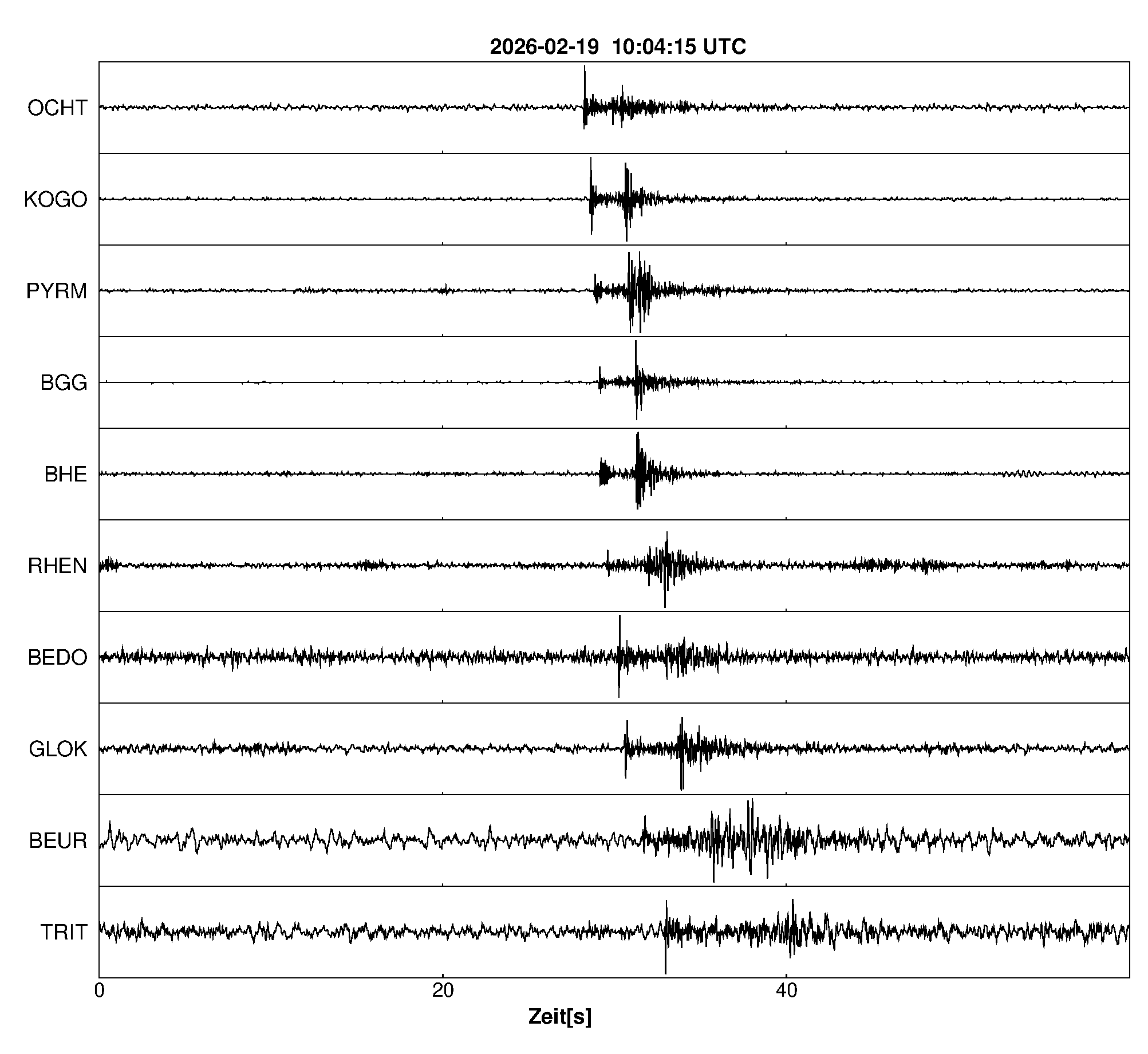 Pfadnavigation Startseite Geologischer Dienst Erdbeben Aktuelle Erdbeben Erdbeben bei Polch, Lkrs. Mayen-Koblenz, RP Teilen Erdbeben bei Polch, Lkrs. Mayen-Koblenz, RP Erdbeben bei: Polch, Lkrs. Mayen-Koblenz, RP Datum/Uhrzeit: am 19.02.2026 um 11:04 Uhr Ortszeit (MEZ) Stärke: 0,9 (Magnitude auf der Richter-Skala) Epizentrum: 50,33° N ㅤ 7,36° E Herdtiefe: ca. 15 km unter der Erdoberfläche Bemerkung: sehr schwaches Erdbeben Seismogramme ausgewählter Erdbebenmessstationen: Erläuterungen: Datum/Uhrzeit:Datum und Zeit des Erdbebens in Ortszeit, also MEZ oder MESZ; Epizentrum:Punkt an der Erdoberfläche über dem Hypozentrum (Lage des Erdbebenherdes in der Tiefe); Magnitude:Erdbebenstärke auf der Richterskala (Lokalmagnitude ML); Herdtiefe:Tiefe des Erdbebens (Hypozentrums) in Kilometern unter NN. Seismogramme:Details zu den Erdbebenmessstationen finden sich im Kartenviewer des LGRB (Baden-Württemberg) und im Kartenviewer des LGB (Rheinland-Pfalz).