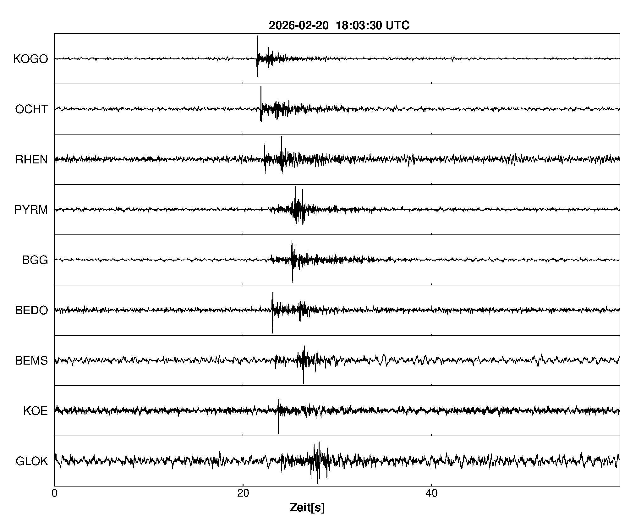 Pfadnavigation Startseite Geologischer Dienst Erdbeben Aktuelle Erdbeben Erdbeben bei Kobern-Gondorf, Lkrs. Mayen-Koblenz, RP Teilen Erdbeben bei Kobern-Gondorf, Lkrs. Mayen-Koblenz, RP Erdbeben bei: Kobern-Gondorf, Lkrs. Mayen-Koblenz, RP Datum/Uhrzeit: am 20.02.2026 um 19:03 Uhr Ortszeit (MEZ) Stärke: 0,5 (Magnitude auf der Richter-Skala) Epizentrum: 50,33° N ㅤ 7,46° E Herdtiefe: ca. 10 km unter der Erdoberfläche Bemerkung: sehr schwaches Erdbeben Seismogramme ausgewählter Erdbebenmessstationen: Erläuterungen: Datum/Uhrzeit:Datum und Zeit des Erdbebens in Ortszeit, also MEZ oder MESZ; Epizentrum:Punkt an der Erdoberfläche über dem Hypozentrum (Lage des Erdbebenherdes in der Tiefe); Magnitude:Erdbebenstärke auf der Richterskala (Lokalmagnitude ML); Herdtiefe:Tiefe des Erdbebens (Hypozentrums) in Kilometern unter NN. Seismogramme:Details zu den Erdbebenmessstationen finden sich im Kartenviewer des LGRB (Baden-Württemberg) und im Kartenviewer des LGB (Rheinland-Pfalz).