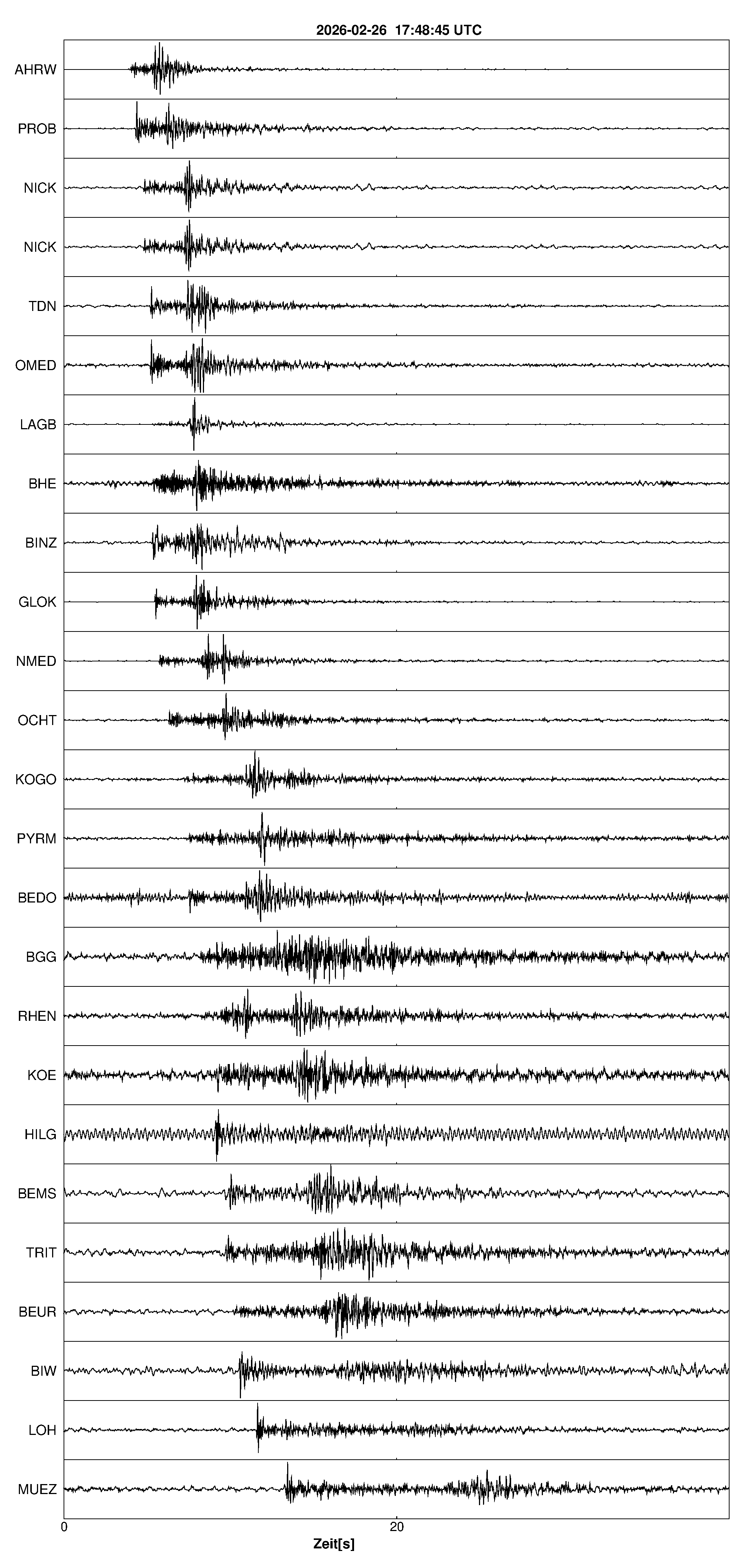 Pfadnavigation Startseite Geologischer Dienst Erdbeben Aktuelle Erdbeben Erdbeben bei Bad Neuenahr-Ahrweiler, Lkrs. Ahrweiler, RP Teilen Erdbeben bei Bad Neuenahr-Ahrweiler, Lkrs. Ahrweiler, RP Erdbeben bei: Bad Neuenahr-Ahrweiler, Lkrs. Ahrweiler, RP Datum/Uhrzeit: am 26.02.2026 um 18:48 Uhr Ortszeit (MEZ) Stärke: 1,2 (Magnitude auf der Richter-Skala) Epizentrum: 50,52° N ㅤ 7,16° E Herdtiefe: ca. 10 km unter der Erdoberfläche Bemerkung: sehr schwaches Erdbeben Seismogramme ausgewählter Erdbebenmessstationen: Erläuterungen: Datum/Uhrzeit:Datum und Zeit des Erdbebens in Ortszeit, also MEZ oder MESZ; Epizentrum:Punkt an der Erdoberfläche über dem Hypozentrum (Lage des Erdbebenherdes in der Tiefe); Magnitude:Erdbebenstärke auf der Richterskala (Lokalmagnitude ML); Herdtiefe:Tiefe des Erdbebens (Hypozentrums) in Kilometern unter NN. Seismogramme:Details zu den Erdbebenmessstationen finden sich im Kartenviewer des LGRB (Baden-Württemberg) und im Kartenviewer des LGB (Rheinland-Pfalz).