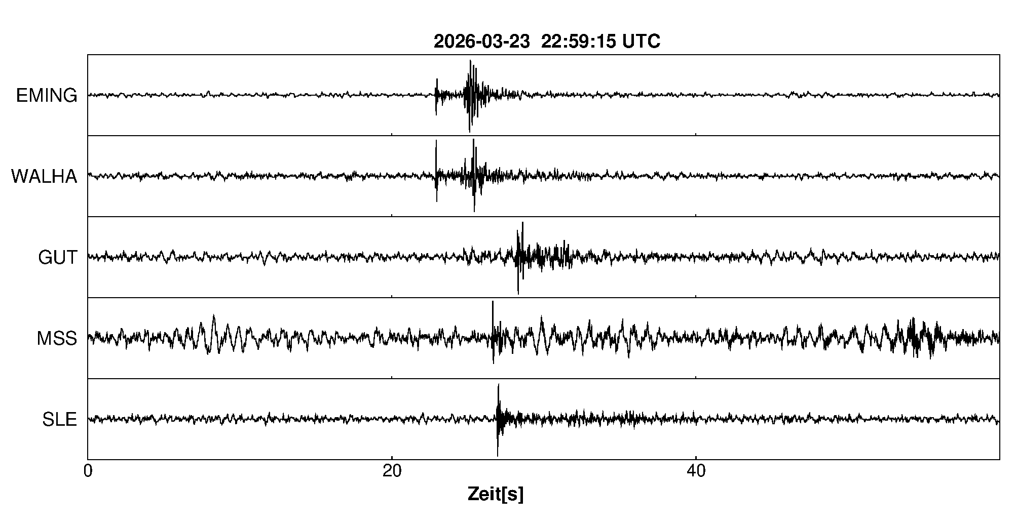 Pfadnavigation Startseite Geologischer Dienst Erdbeben Aktuelle Erdbeben Erdbeben bei Stockach, Lkrs. Konstanz, BW Teilen Erdbeben bei Stockach, Lkrs. Konstanz, BW Erdbeben bei: Stockach, Lkrs. Konstanz, BW Datum/Uhrzeit: am 23.03.2026 um 23:59 Uhr Ortszeit (MEZ) Stärke: 0,6 (Magnitude auf der Richter-Skala) Epizentrum: 47,85° N ㅤ 9,01° E Herdtiefe: ca. 9 km unter der Erdoberfläche Bemerkung: sehr schwaches Erdbeben Seismogramme ausgewählter Erdbebenmessstationen: Erläuterungen: Datum/Uhrzeit:Datum und Zeit des Erdbebens in Ortszeit, also MEZ oder MESZ; Epizentrum:Punkt an der Erdoberfläche über dem Hypozentrum (Lage des Erdbebenherdes in der Tiefe); Magnitude:Erdbebenstärke auf der Richterskala (Lokalmagnitude ML); Herdtiefe:Tiefe des Erdbebens (Hypozentrums) in Kilometern unter NN. Seismogramme:Details zu den Erdbebenmessstationen finden sich im Kartenviewer des LGRB (Baden-Württemberg) und im Kartenviewer des LGB (Rheinland-Pfalz).