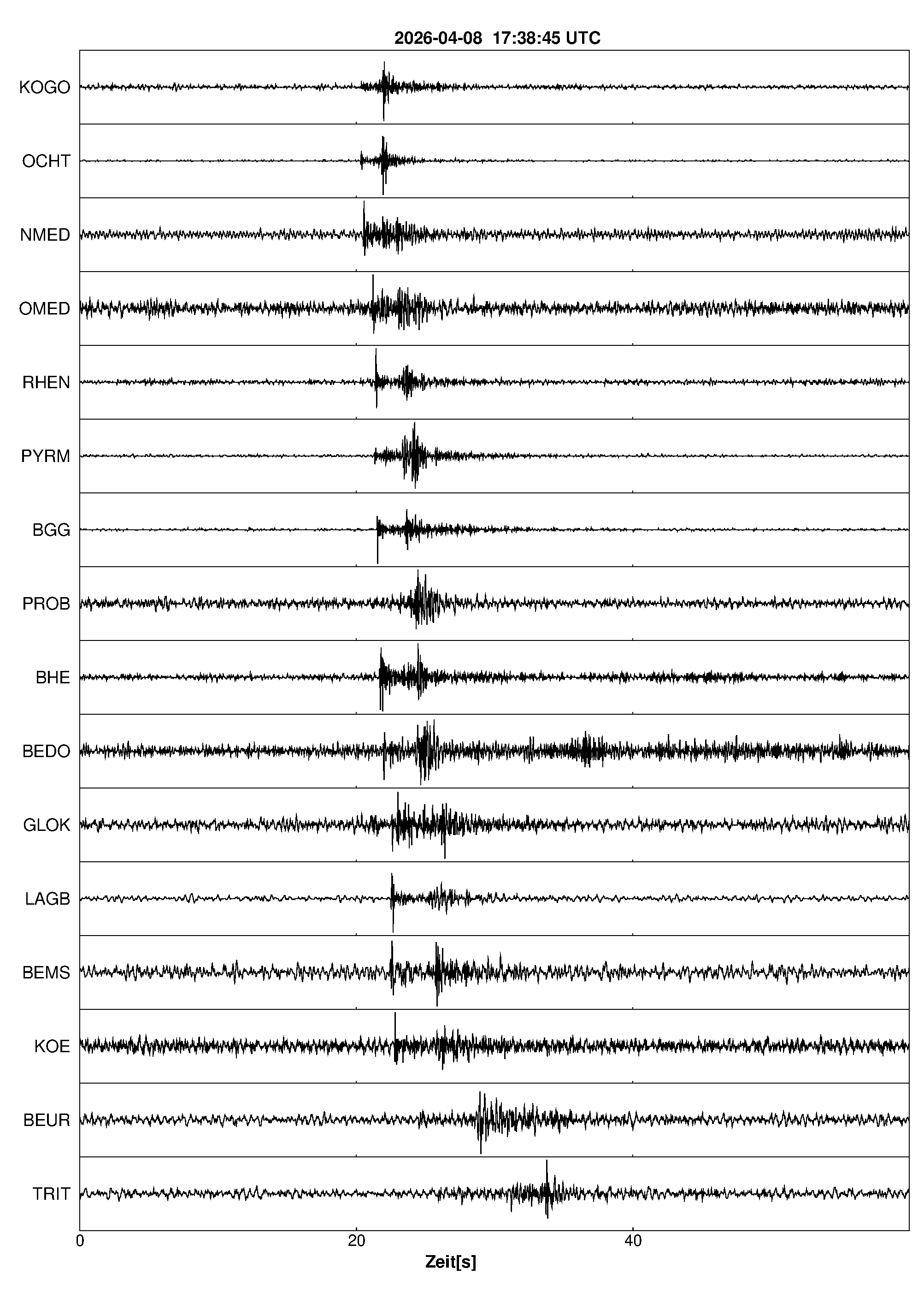 Pfadnavigation Startseite Geologischer Dienst Erdbeben Aktuelle Erdbeben Erdbeben bei Bassenheim, Lkrs. Mayen-Koblenz, RP Teilen Erdbeben bei Bassenheim, Lkrs. Mayen-Koblenz, RP Erdbeben bei: Bassenheim, Lkrs. Mayen-Koblenz, RP Datum/Uhrzeit: am 08.04.2026 um 19:39 Uhr Ortszeit (MESZ) Stärke: 0,8 (Magnitude auf der Richter-Skala) Epizentrum: 50,34° N ㅤ 7,41° E Herdtiefe: ca. 11 km unter der Erdoberfläche Bemerkung: sehr schwaches Erdbeben Seismogramme ausgewählter Erdbebenmessstationen: Erläuterungen: Datum/Uhrzeit:Datum und Zeit des Erdbebens in Ortszeit, also MEZ oder MESZ; Epizentrum:Punkt an der Erdoberfläche über dem Hypozentrum (Lage des Erdbebenherdes in der Tiefe); Magnitude:Erdbebenstärke auf der Richterskala (Lokalmagnitude ML); Herdtiefe:Tiefe des Erdbebens (Hypozentrums) in Kilometern unter NN. Seismogramme:Details zu den Erdbebenmessstationen finden sich im Kartenviewer des LGRB (Baden-Württemberg) und im Kartenviewer des LGB (Rheinland-Pfalz).
