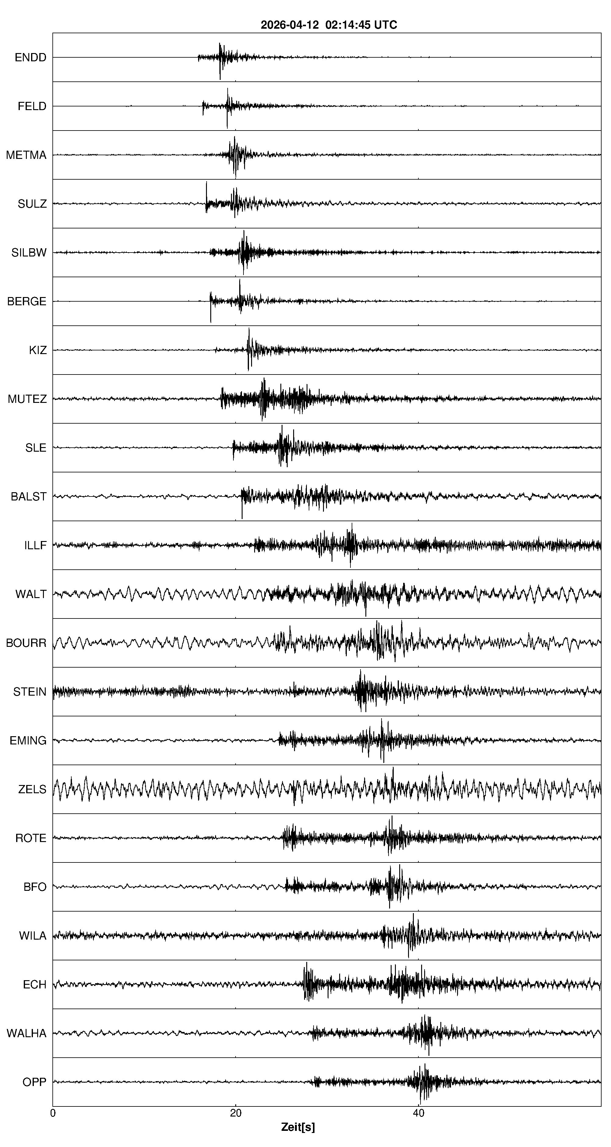 Pfadnavigation Startseite Geologischer Dienst Erdbeben Aktuelle Erdbeben Erdbeben bei Schopfheim, Lkrs. Lörrach, BW Teilen Erdbeben bei Schopfheim, Lkrs. Lörrach, BW Erdbeben bei: Schopfheim, Lkrs. Lörrach, BW Datum/Uhrzeit: am 12.04.2026 um 04:14 Uhr Ortszeit (MESZ) Stärke: 1,3 (Magnitude auf der Richter-Skala) Epizentrum: 47,70° N ㅤ 7,97° E Herdtiefe: ca. 7 km unter der Erdoberfläche Bemerkung: sehr schwaches Erdbeben Seismogramme ausgewählter Erdbebenmessstationen: Erläuterungen: Datum/Uhrzeit:Datum und Zeit des Erdbebens in Ortszeit, also MEZ oder MESZ; Epizentrum:Punkt an der Erdoberfläche über dem Hypozentrum (Lage des Erdbebenherdes in der Tiefe); Magnitude:Erdbebenstärke auf der Richterskala (Lokalmagnitude ML); Herdtiefe:Tiefe des Erdbebens (Hypozentrums) in Kilometern unter NN. Seismogramme:Details zu den Erdbebenmessstationen finden sich im Kartenviewer des LGRB (Baden-Württemberg) und im Kartenviewer des LGB (Rheinland-Pfalz).