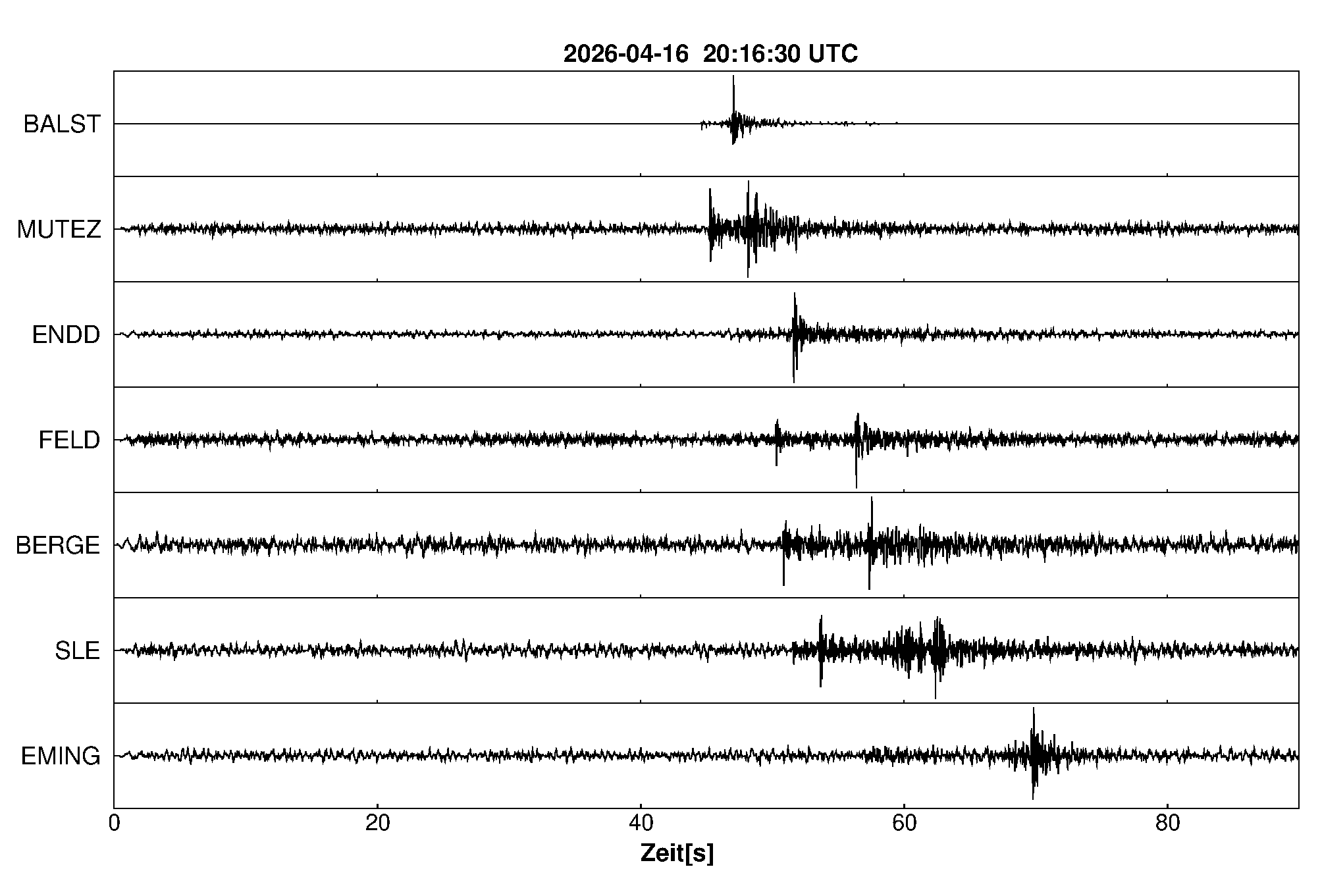 Pfadnavigation Startseite Geologischer Dienst Erdbeben Aktuelle Erdbeben Erdbeben bei Rünenberg, Kt. Basel-Landschaft, CH Teilen Erdbeben bei Rünenberg, Kt. Basel-Landschaft, CH Erdbeben außerhalb von Baden-Württemberg und Rheinland-Pfalz:Die maßgeblichen Angaben veröffentlicht der lokal zuständige Erdbebendienst. Erdbeben bei: Rünenberg, Kt. Basel-Landschaft, CH Datum/Uhrzeit: am 16.04.2026 um 22:17 Uhr Ortszeit (MESZ) Stärke: 0,7 (Magnitude auf der Richter-Skala) Epizentrum: 47,43° N ㅤ 7,88° E Herdtiefe: ca. 8 km unter der Erdoberfläche Bemerkung: sehr schwaches Erdbeben Seismogramme ausgewählter Erdbebenmessstationen: Erläuterungen: Datum/Uhrzeit:Datum und Zeit des Erdbebens in Ortszeit, also MEZ oder MESZ; Epizentrum:Punkt an der Erdoberfläche über dem Hypozentrum (Lage des Erdbebenherdes in der Tiefe); Magnitude:Erdbebenstärke auf der Richterskala (Lokalmagnitude ML); Herdtiefe:Tiefe des Erdbebens (Hypozentrums) in Kilometern unter NN. Seismogramme:Details zu den Erdbebenmessstationen finden sich im Kartenviewer des LGRB (Baden-Württemberg) und im Kartenviewer des LGB (Rheinland-Pfalz).