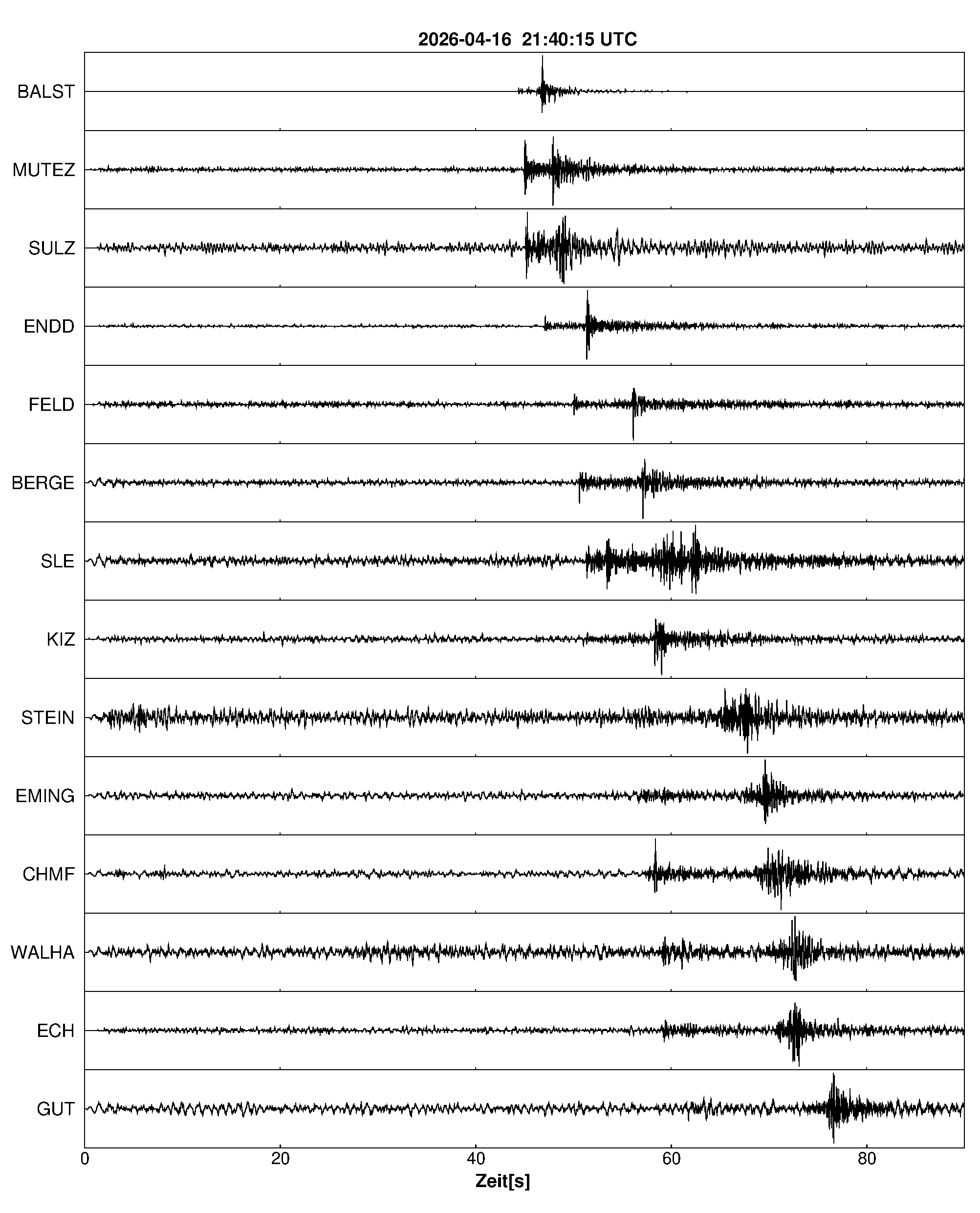 Pfadnavigation Startseite Geologischer Dienst Erdbeben Aktuelle Erdbeben Erdbeben bei Rünenberg, Kt. Basel-Landschaft, CH Teilen Erdbeben bei Rünenberg, Kt. Basel-Landschaft, CH Erdbeben außerhalb von Baden-Württemberg und Rheinland-Pfalz:Die maßgeblichen Angaben veröffentlicht der lokal zuständige Erdbebendienst. Erdbeben bei: Rünenberg, Kt. Basel-Landschaft, CH Datum/Uhrzeit: am 16.04.2026 um 23:40 Uhr Ortszeit (MESZ) Stärke: 0,9 (Magnitude auf der Richter-Skala) Epizentrum: 47,43° N ㅤ 7,89° E Herdtiefe: ca. 8 km unter der Erdoberfläche Bemerkung: sehr schwaches Erdbeben Seismogramme ausgewählter Erdbebenmessstationen: Erläuterungen: Datum/Uhrzeit:Datum und Zeit des Erdbebens in Ortszeit, also MEZ oder MESZ; Epizentrum:Punkt an der Erdoberfläche über dem Hypozentrum (Lage des Erdbebenherdes in der Tiefe); Magnitude:Erdbebenstärke auf der Richterskala (Lokalmagnitude ML); Herdtiefe:Tiefe des Erdbebens (Hypozentrums) in Kilometern unter NN. Seismogramme:Details zu den Erdbebenmessstationen finden sich im Kartenviewer des LGRB (Baden-Württemberg) und im Kartenviewer des LGB (Rheinland-Pfalz).