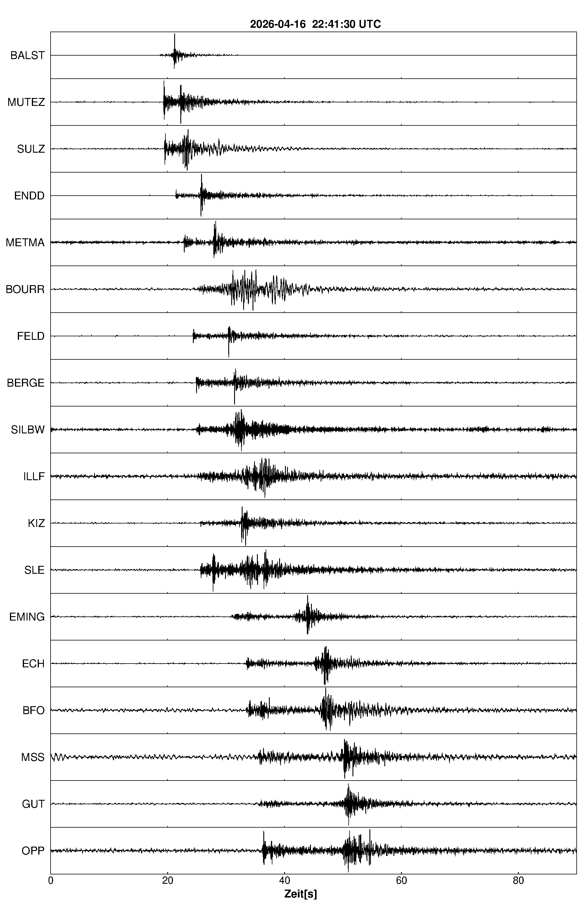 Pfadnavigation Startseite Geologischer Dienst Erdbeben Aktuelle Erdbeben Erdbeben bei Rünenberg, Kt. Basel-Landschaft, CH Teilen Erdbeben bei Rünenberg, Kt. Basel-Landschaft, CH Erdbeben außerhalb von Baden-Württemberg und Rheinland-Pfalz:Die maßgeblichen Angaben veröffentlicht der lokal zuständige Erdbebendienst. Erdbeben bei: Rünenberg, Kt. Basel-Landschaft, CH Datum/Uhrzeit: am 17.04.2026 um 00:41 Uhr Ortszeit (MESZ) Stärke: 1,5 (Magnitude auf der Richter-Skala) Epizentrum: 47,43° N ㅤ 7,88° E Herdtiefe: ca. 7 km unter der Erdoberfläche Bemerkung: sehr schwaches Erdbeben Seismogramme ausgewählter Erdbebenmessstationen: Erläuterungen: Datum/Uhrzeit:Datum und Zeit des Erdbebens in Ortszeit, also MEZ oder MESZ; Epizentrum:Punkt an der Erdoberfläche über dem Hypozentrum (Lage des Erdbebenherdes in der Tiefe); Magnitude:Erdbebenstärke auf der Richterskala (Lokalmagnitude ML); Herdtiefe:Tiefe des Erdbebens (Hypozentrums) in Kilometern unter NN. Seismogramme:Details zu den Erdbebenmessstationen finden sich im Kartenviewer des LGRB (Baden-Württemberg) und im Kartenviewer des LGB (Rheinland-Pfalz).