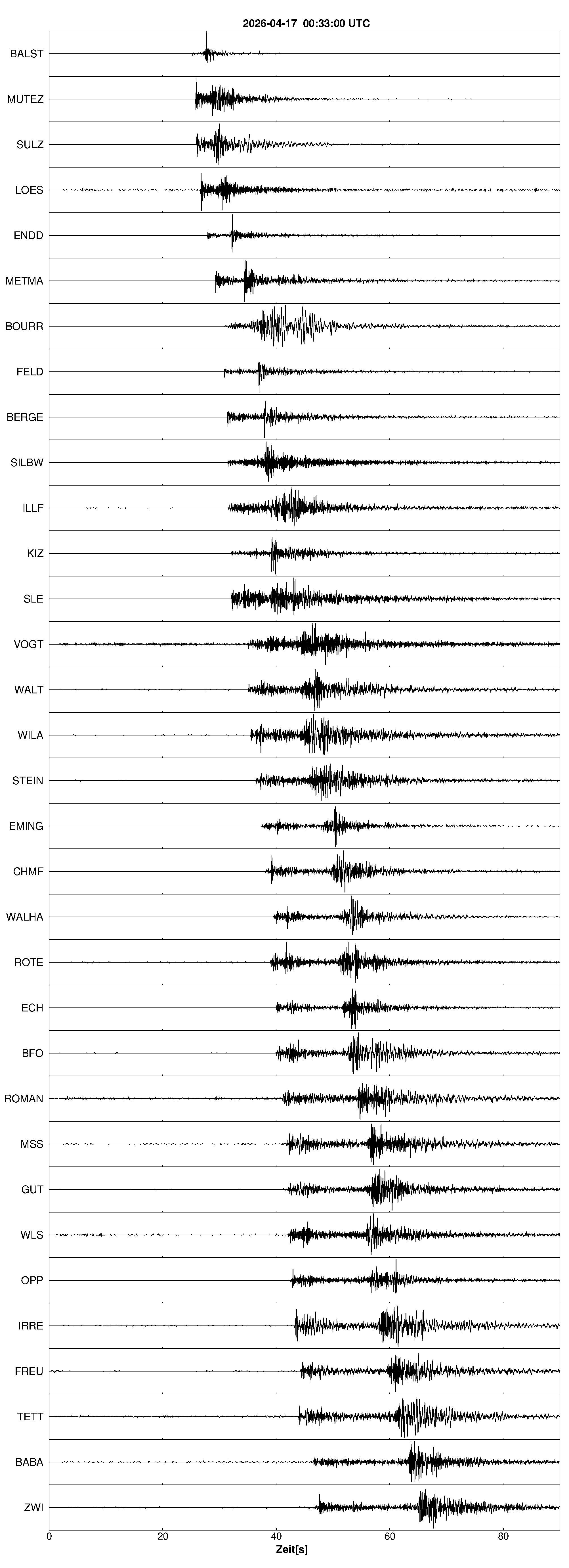 Pfadnavigation Startseite Geologischer Dienst Erdbeben Aktuelle Erdbeben Erdbeben bei Rünenberg, Kt. Basel-Landschaft, CH Teilen Erdbeben bei Rünenberg, Kt. Basel-Landschaft, CH Erdbeben außerhalb von Baden-Württemberg und Rheinland-Pfalz:Die maßgeblichen Angaben veröffentlicht der lokal zuständige Erdbebendienst. Erdbeben bei: Rünenberg, Kt. Basel-Landschaft, CH Datum/Uhrzeit: am 17.04.2026 um 02:33 Uhr Ortszeit (MESZ) Stärke: 2,3 (Magnitude auf der Richter-Skala) Epizentrum: 47,43° N ㅤ 7,89° E Herdtiefe: ca. 7 km unter der Erdoberfläche Bemerkung: schwaches Erdbeben Seismogramme ausgewählter Erdbebenmessstationen: Erläuterungen: Datum/Uhrzeit:Datum und Zeit des Erdbebens in Ortszeit, also MEZ oder MESZ; Epizentrum:Punkt an der Erdoberfläche über dem Hypozentrum (Lage des Erdbebenherdes in der Tiefe); Magnitude:Erdbebenstärke auf der Richterskala (Lokalmagnitude ML); Herdtiefe:Tiefe des Erdbebens (Hypozentrums) in Kilometern unter NN. Seismogramme:Details zu den Erdbebenmessstationen finden sich im Kartenviewer des LGRB (Baden-Württemberg) und im Kartenviewer des LGB (Rheinland-Pfalz).
