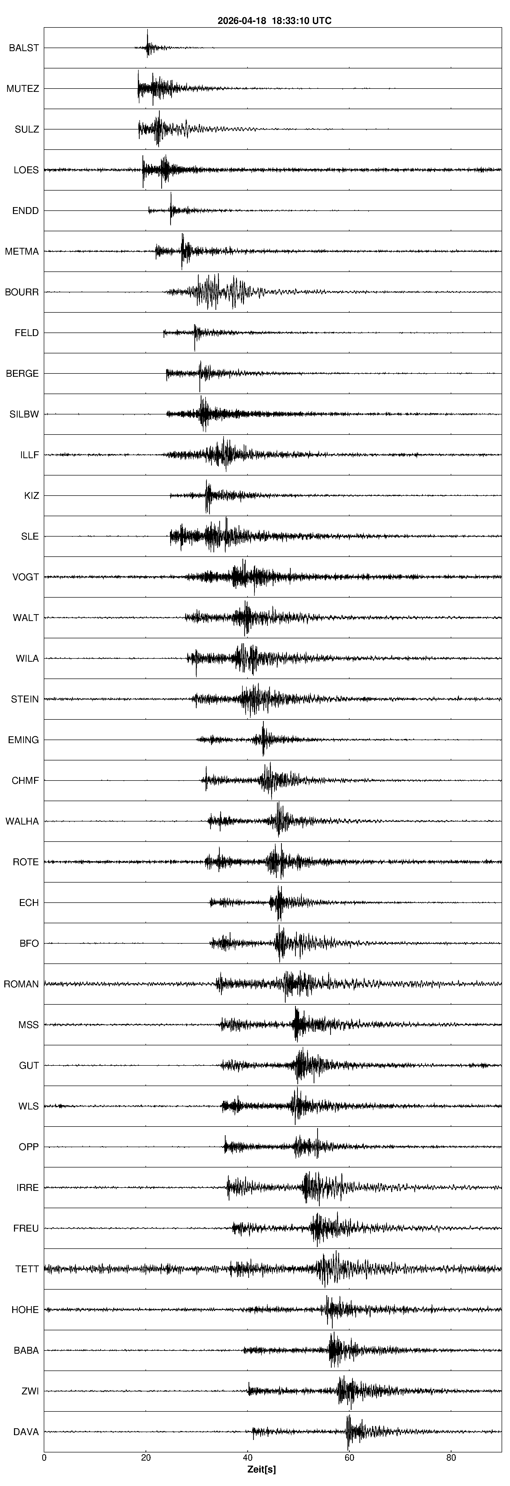 Pfadnavigation Startseite Geologischer Dienst Erdbeben Aktuelle Erdbeben Erdbeben bei Rünenberg, Kt. Basel-Landschaft, CH Teilen Erdbeben bei Rünenberg, Kt. Basel-Landschaft, CH Erdbeben außerhalb von Baden-Württemberg und Rheinland-Pfalz:Die maßgeblichen Angaben veröffentlicht der lokal zuständige Erdbebendienst. Erdbeben bei: Rünenberg, Kt. Basel-Landschaft, CH Datum/Uhrzeit: am 18.04.2026 um 20:33 Uhr Ortszeit (MESZ) Stärke: 2,1 (Magnitude auf der Richter-Skala) Epizentrum: 47,43° N ㅤ 7,88° E Herdtiefe: ca. 7 km unter der Erdoberfläche Bemerkung: schwaches Erdbeben Seismogramme ausgewählter Erdbebenmessstationen: Erläuterungen: Datum/Uhrzeit:Datum und Zeit des Erdbebens in Ortszeit, also MEZ oder MESZ; Epizentrum:Punkt an der Erdoberfläche über dem Hypozentrum (Lage des Erdbebenherdes in der Tiefe); Magnitude:Erdbebenstärke auf der Richterskala (Lokalmagnitude ML); Herdtiefe:Tiefe des Erdbebens (Hypozentrums) in Kilometern unter NN. Seismogramme:Details zu den Erdbebenmessstationen finden sich im Kartenviewer des LGRB (Baden-Württemberg) und im Kartenviewer des LGB (Rheinland-Pfalz).