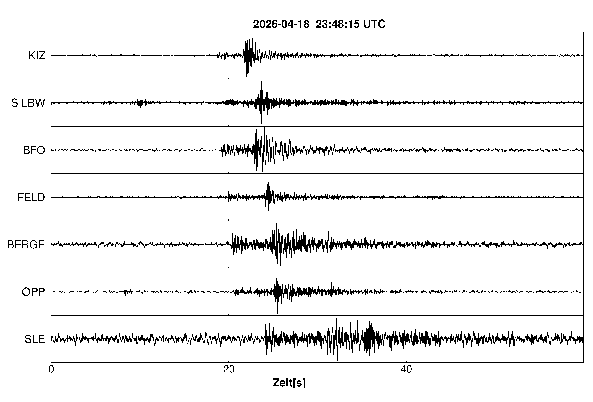 Pfadnavigation Startseite Geologischer Dienst Erdbeben Aktuelle Erdbeben Erdbeben bei Elzach, Lkrs. Emmendingen, BW Teilen Erdbeben bei Elzach, Lkrs. Emmendingen, BW Erdbeben bei: Elzach, Lkrs. Emmendingen, BW Datum/Uhrzeit: am 19.04.2026 um 01:48 Uhr Ortszeit (MESZ) Stärke: 0,9 (Magnitude auf der Richter-Skala) Epizentrum: 48,17° N ㅤ 8,01° E Herdtiefe: ca. 4 km unter der Erdoberfläche Bemerkung: sehr schwaches Erdbeben Seismogramme ausgewählter Erdbebenmessstationen: Erläuterungen: Datum/Uhrzeit:Datum und Zeit des Erdbebens in Ortszeit, also MEZ oder MESZ; Epizentrum:Punkt an der Erdoberfläche über dem Hypozentrum (Lage des Erdbebenherdes in der Tiefe); Magnitude:Erdbebenstärke auf der Richterskala (Lokalmagnitude ML); Herdtiefe:Tiefe des Erdbebens (Hypozentrums) in Kilometern unter NN. Seismogramme:Details zu den Erdbebenmessstationen finden sich im Kartenviewer des LGRB (Baden-Württemberg) und im Kartenviewer des LGB (Rheinland-Pfalz).