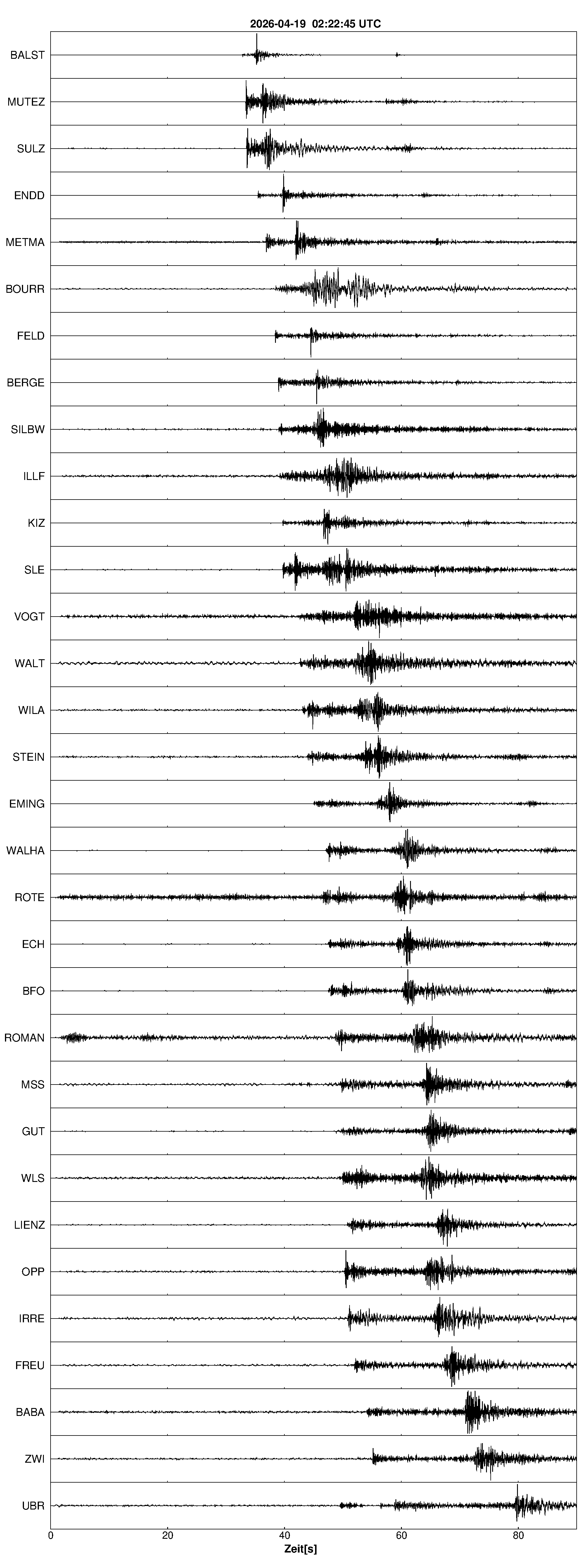 Pfadnavigation Startseite Geologischer Dienst Erdbeben Aktuelle Erdbeben Erdbeben bei Rünenberg, Kt. Basel-Landschaft, CH Teilen Erdbeben bei Rünenberg, Kt. Basel-Landschaft, CH Erdbeben außerhalb von Baden-Württemberg und Rheinland-Pfalz:Die maßgeblichen Angaben veröffentlicht der lokal zuständige Erdbebendienst. Erdbeben bei: Rünenberg, Kt. Basel-Landschaft, CH Datum/Uhrzeit: am 19.04.2026 um 04:23 Uhr Ortszeit (MESZ) Stärke: 1,7 (Magnitude auf der Richter-Skala) Epizentrum: 47,43° N ㅤ 7,89° E Herdtiefe: ca. 8 km unter der Erdoberfläche Bemerkung: sehr schwaches Erdbeben Seismogramme ausgewählter Erdbebenmessstationen: Erläuterungen: Datum/Uhrzeit:Datum und Zeit des Erdbebens in Ortszeit, also MEZ oder MESZ; Epizentrum:Punkt an der Erdoberfläche über dem Hypozentrum (Lage des Erdbebenherdes in der Tiefe); Magnitude:Erdbebenstärke auf der Richterskala (Lokalmagnitude ML); Herdtiefe:Tiefe des Erdbebens (Hypozentrums) in Kilometern unter NN. Seismogramme:Details zu den Erdbebenmessstationen finden sich im Kartenviewer des LGRB (Baden-Württemberg) und im Kartenviewer des LGB (Rheinland-Pfalz).