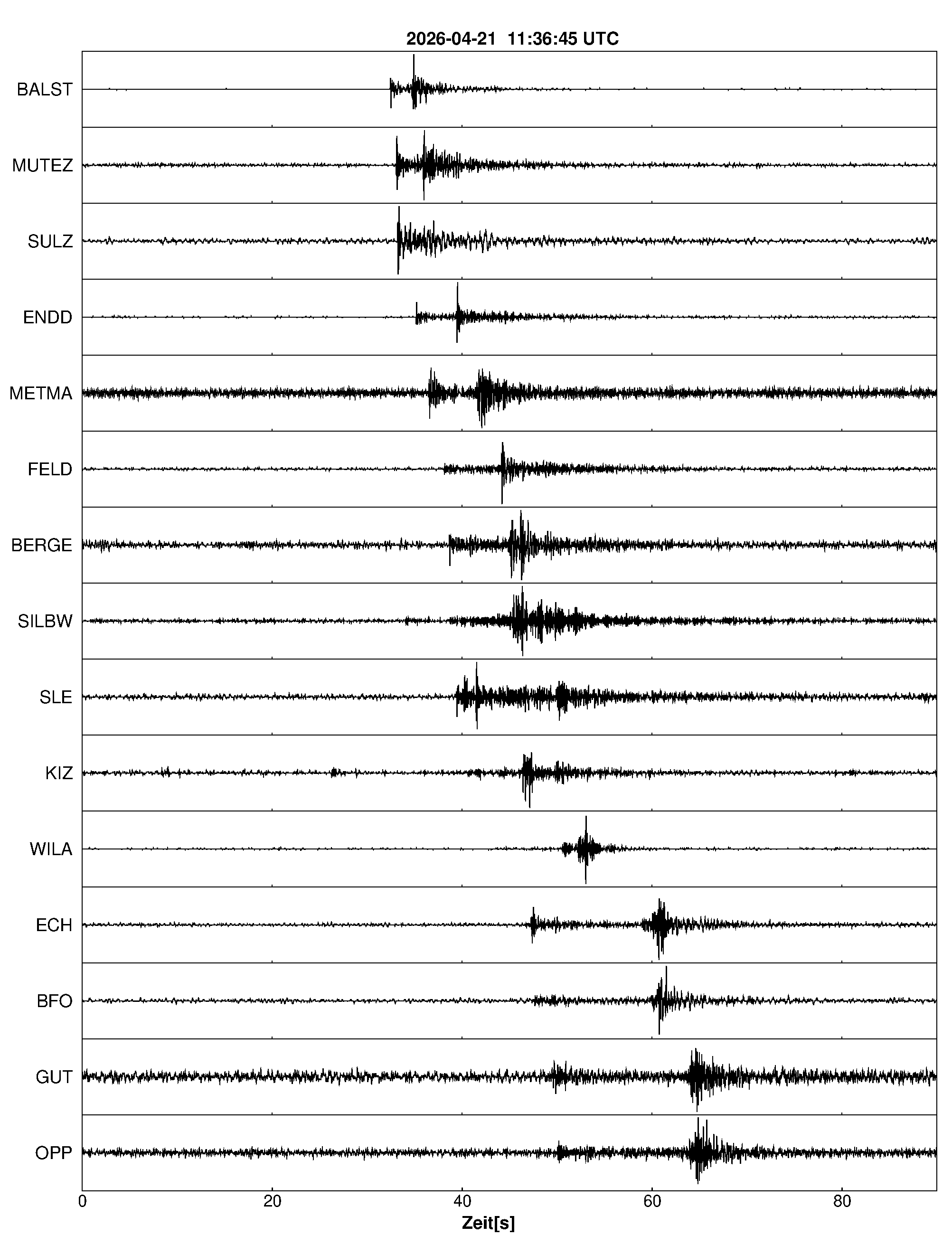 Pfadnavigation Startseite Geologischer Dienst Erdbeben Aktuelle Erdbeben Erdbeben bei Rünenberg, Kt. Basel-Landschaft, CH Teilen Erdbeben bei Rünenberg, Kt. Basel-Landschaft, CH Erdbeben außerhalb von Baden-Württemberg und Rheinland-Pfalz:Die maßgeblichen Angaben veröffentlicht der lokal zuständige Erdbebendienst. Erdbeben bei: Rünenberg, Kt. Basel-Landschaft, CH Datum/Uhrzeit: am 21.04.2026 um 13:37 Uhr Ortszeit (MESZ) Stärke: 1,6 (Magnitude auf der Richter-Skala) Epizentrum: 47,42° N ㅤ 7,89° E Herdtiefe: ca. 7 km unter der Erdoberfläche Bemerkung: sehr schwaches Erdbeben Seismogramme ausgewählter Erdbebenmessstationen: Erläuterungen: Datum/Uhrzeit:Datum und Zeit des Erdbebens in Ortszeit, also MEZ oder MESZ; Epizentrum:Punkt an der Erdoberfläche über dem Hypozentrum (Lage des Erdbebenherdes in der Tiefe); Magnitude:Erdbebenstärke auf der Richterskala (Lokalmagnitude ML); Herdtiefe:Tiefe des Erdbebens (Hypozentrums) in Kilometern unter NN. Seismogramme:Details zu den Erdbebenmessstationen finden sich im Kartenviewer des LGRB (Baden-Württemberg) und im Kartenviewer des LGB (Rheinland-Pfalz).
